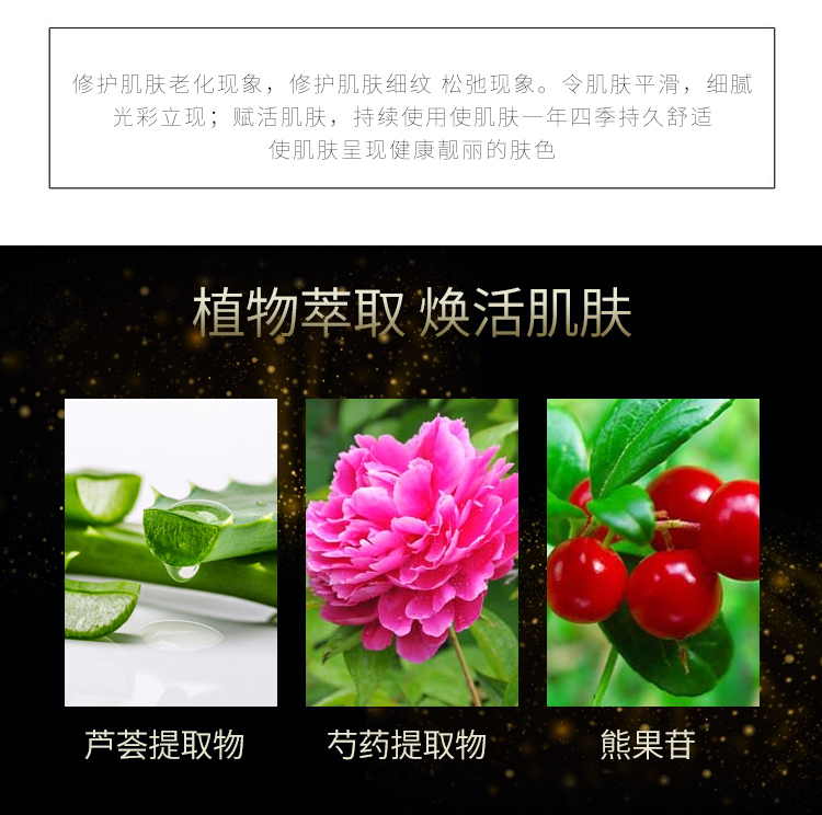 产品说明:减缓肌肤老化痕迹的产生,改善肌肤细纹、暗沉、松弛现象的产生,令肌肤平滑、细腻、光彩立现;赋活肌肤,使肌肤一年四季持久舒适,令肌肤呈现健康、靓丽的美好状态