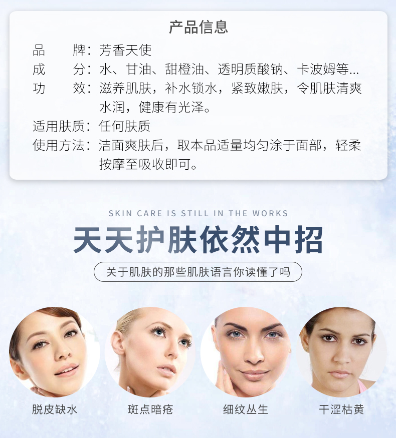 滋养肌肤,补水锁水,紧致嫩肤,令肌肤清爽水润,健康有光泽。(使用方法:洁面爽肤后,取本品适量均匀涂于面