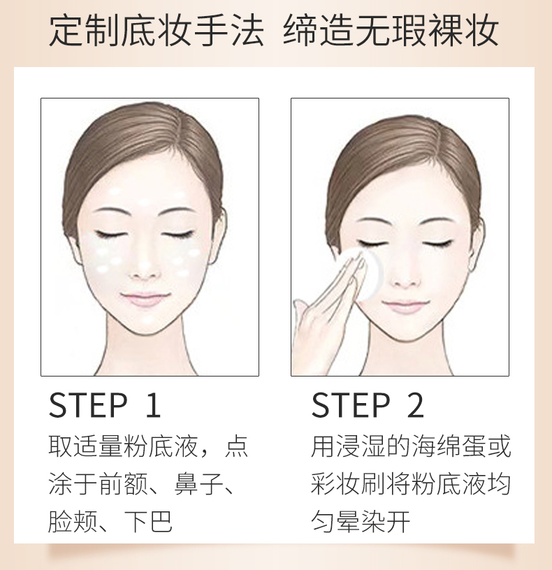使用方法:用于防晒隔离乳后,取适量均匀涂抹于全脸及颈部肌肤,以指腹或粉扑轻轻涂匀即可。