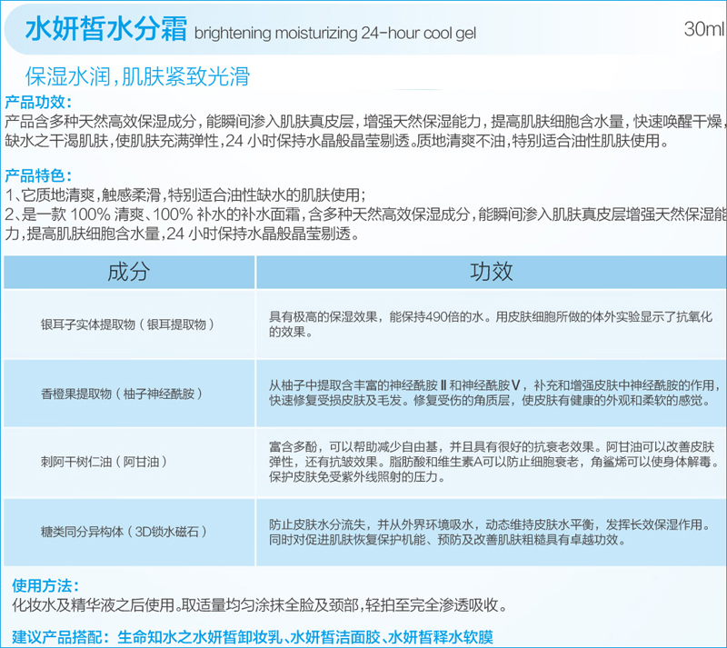 产品功效:产品含多种天然保湿成分,能瞬间渗入肌肤真皮层,增强天然保湿能力,提高肌肤含水量,即时唤醒干燥,缺水之干渴肌肤,使肌肤充满弹性,24小时保持水晶般晶莹剔透。质地清爽不油,特别适合油性肌肤使用。