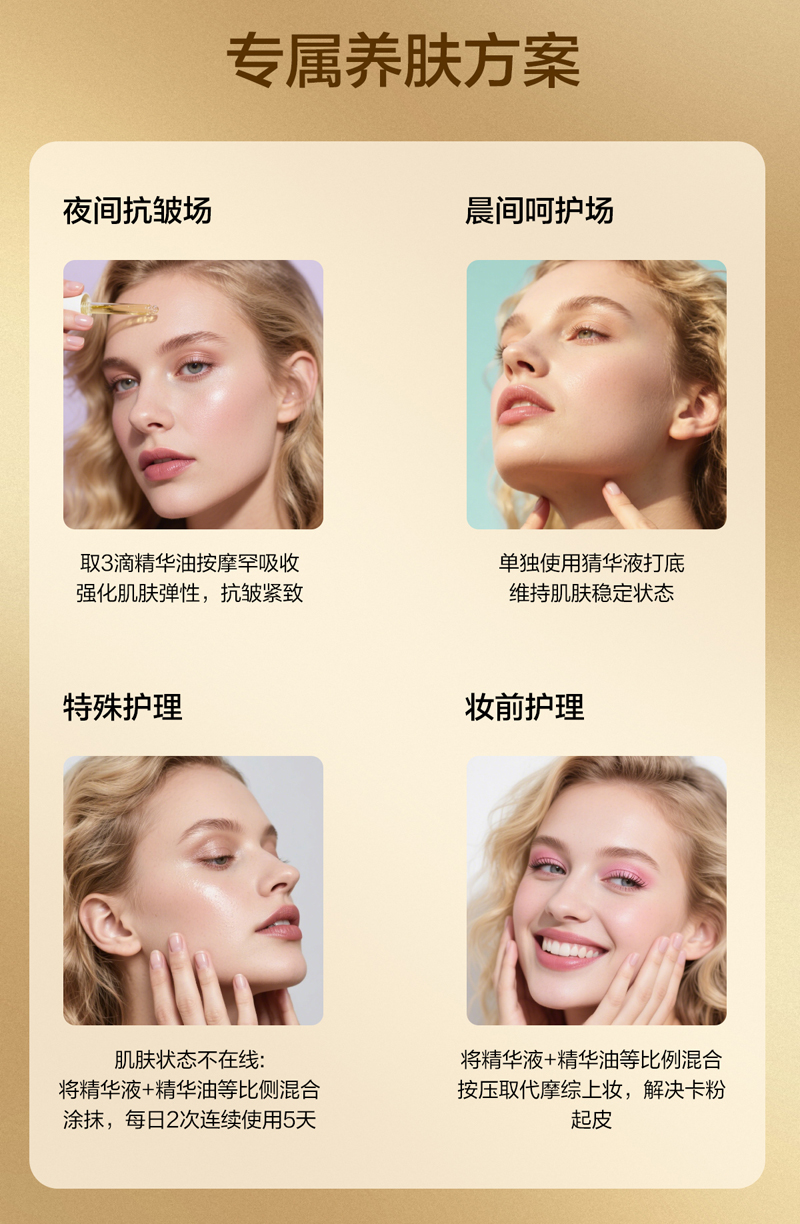 白池花籽油、霍霍巴籽油等多重奢华油协同作用,以油养肤,滋养抗皱,令肌肤水润细腻。(洁面爽肤后使用,取适量产品于掌心,均匀涂抹于整个面部,按摩直至完全吸收即可)