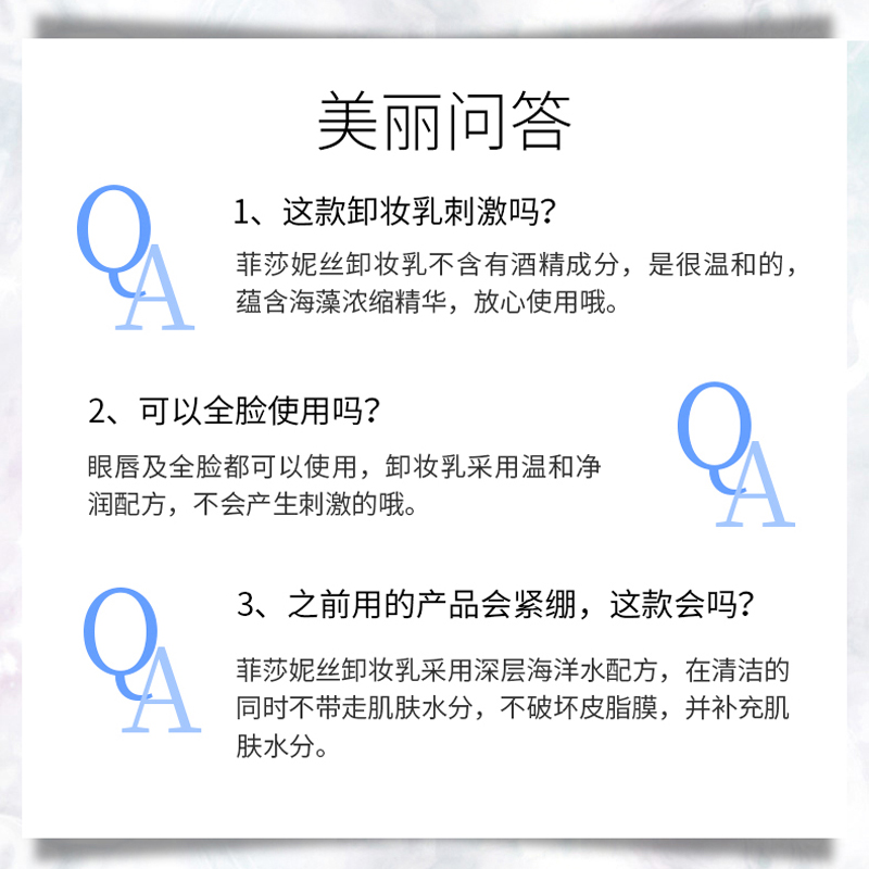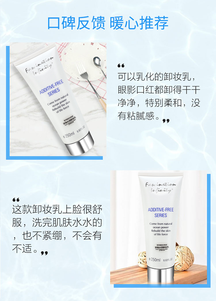 优异保湿果的柔和卸妆乳,温和无刺激,能溶解彩妆及多余油脂,轻盈完整地包覆您的脸,轻松卸除脸部污垢,蕴含深海多种天然保湿成分,可软化肌肤老死,恢复肌肤的弹力与张力,令卸妆后的肌肤水润舒爽,无紧绷干涩的感觉。