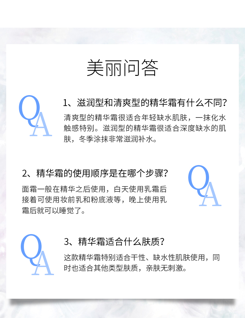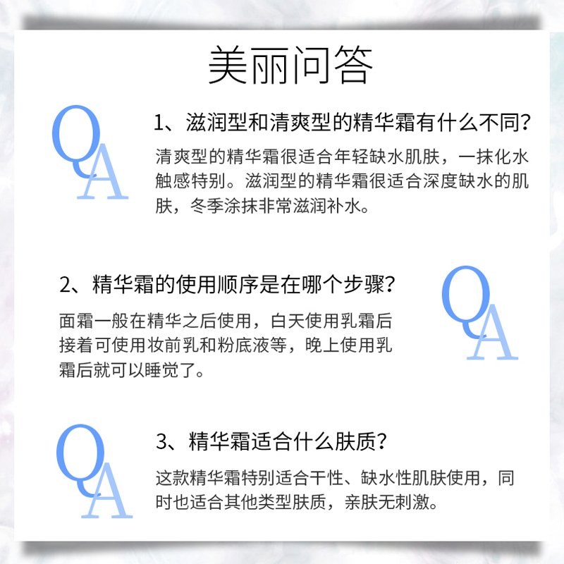 适合肤质:任何肤质;特别适合干燥 缺水性肌肤。