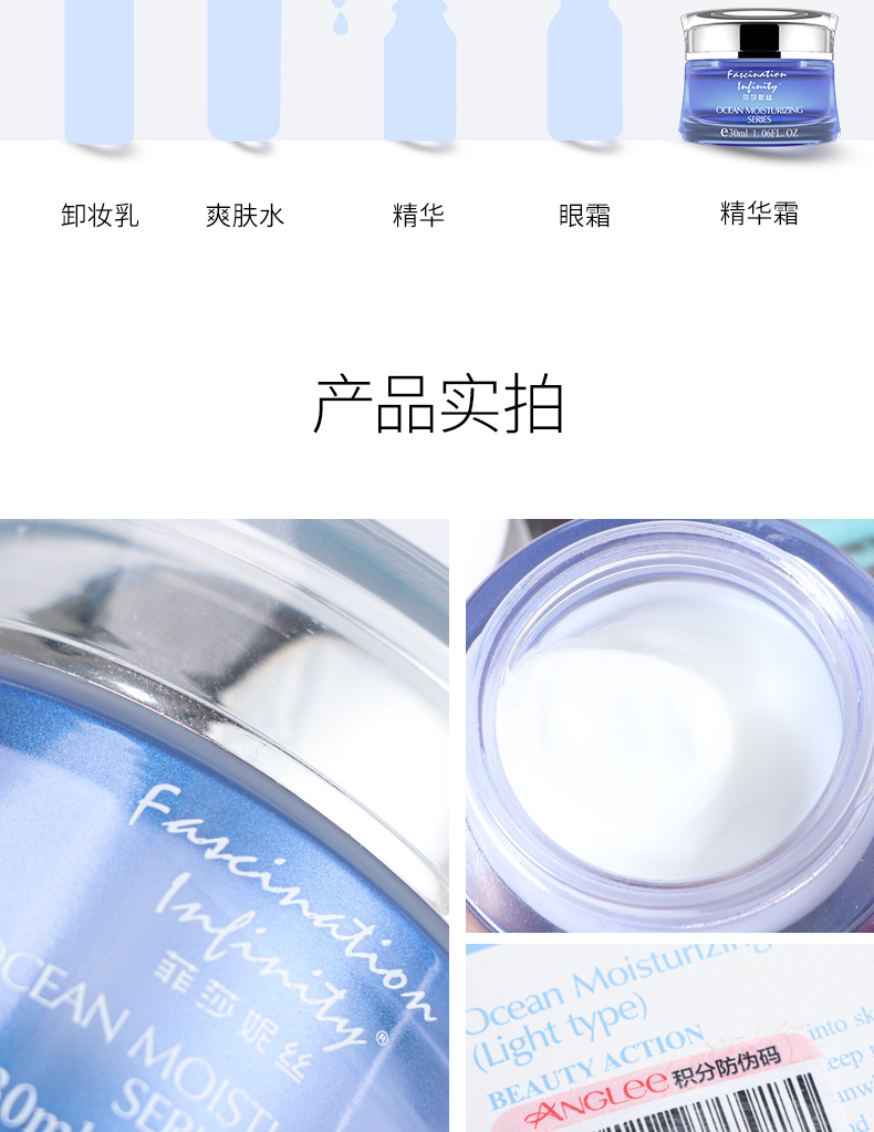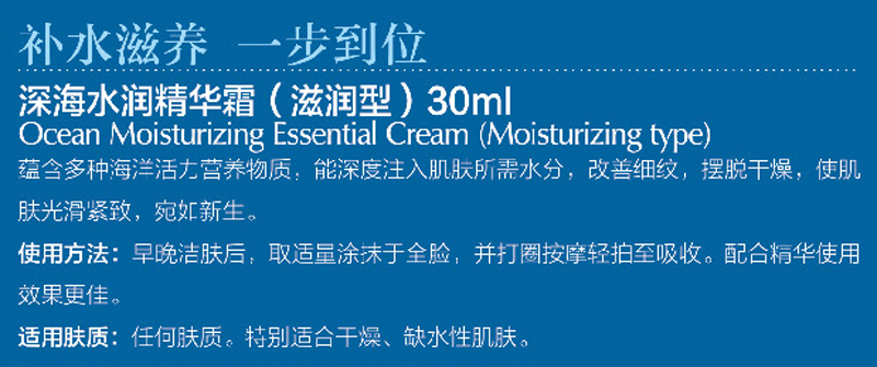 产品特点:蕴含多种海洋活力营养物质,能深度注入肌肤所需水分,发挥全天候保湿及焕亮肤色之功,针对肌肤因深度缺水而产生的细纹,脱屑等状况,滋养果佳。可改善细纹,摆脱干燥,使肌肤光滑紧致,宛如新生.