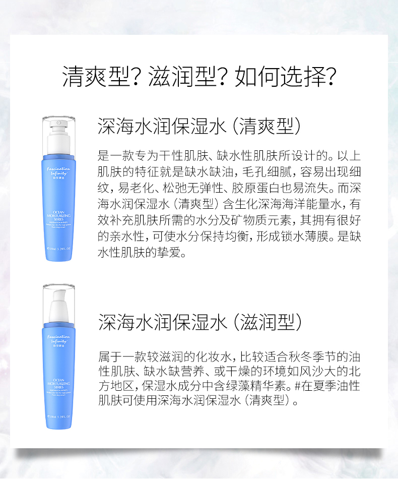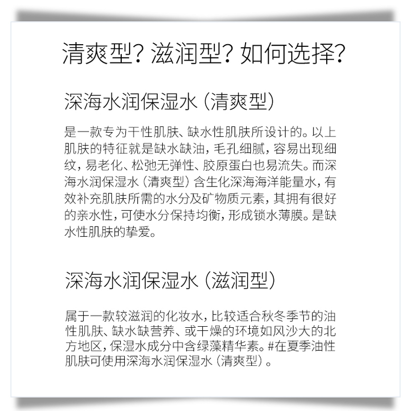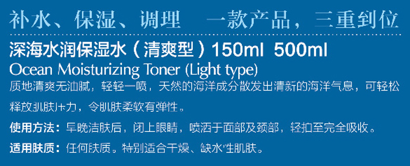 产品用途:补水、保湿、调理、一款产品、三重到位,蕴含生化糖醛酸保湿精华,可即时渗入肌肤强力补水,使每一寸肌肤喝饱水的同时在皮肤表面形成水润保护膜。深海多种矿物精华,可以软化肌肤角质,改善因换季产生的肌肤脱皮、干燥、粗糙等问题,舒缓保湿、令肌肤时刻呈现水润剔透。