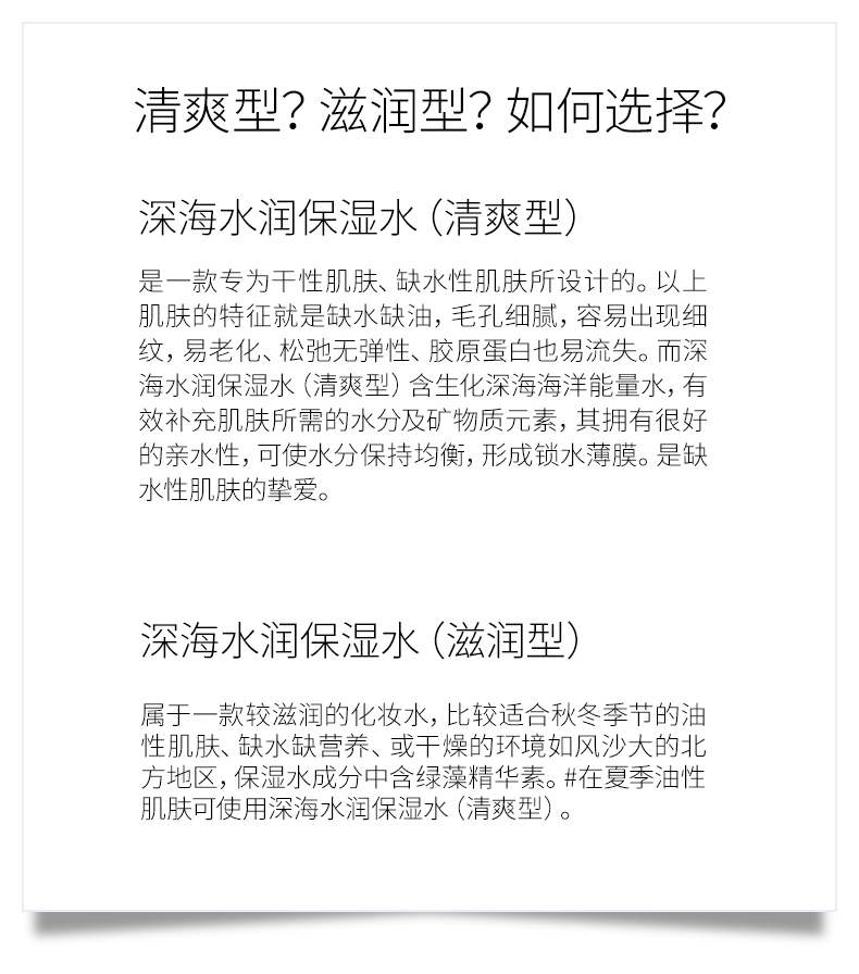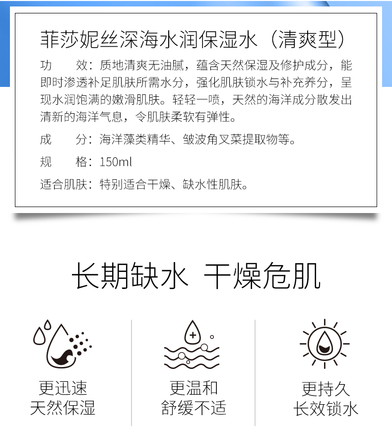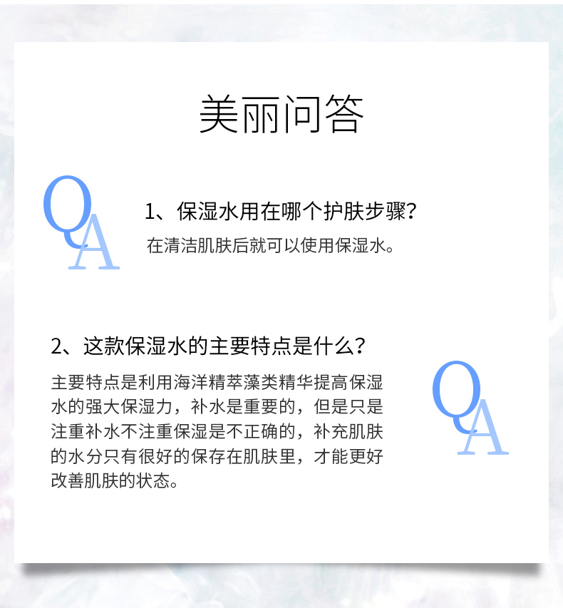 产品用途:补水、保湿、调理、一款产品、三重到位,蕴含生化糖醛酸保湿精华,可即时渗入肌肤强力补水,使每一寸肌肤喝饱水的同时在皮肤表面形成水润保护膜。深海多种矿物精华,可以软化肌肤角质,改善因换季产生的肌肤脱皮、干燥、粗糙等问题,舒缓保湿、令肌肤时刻呈现水润剔透。