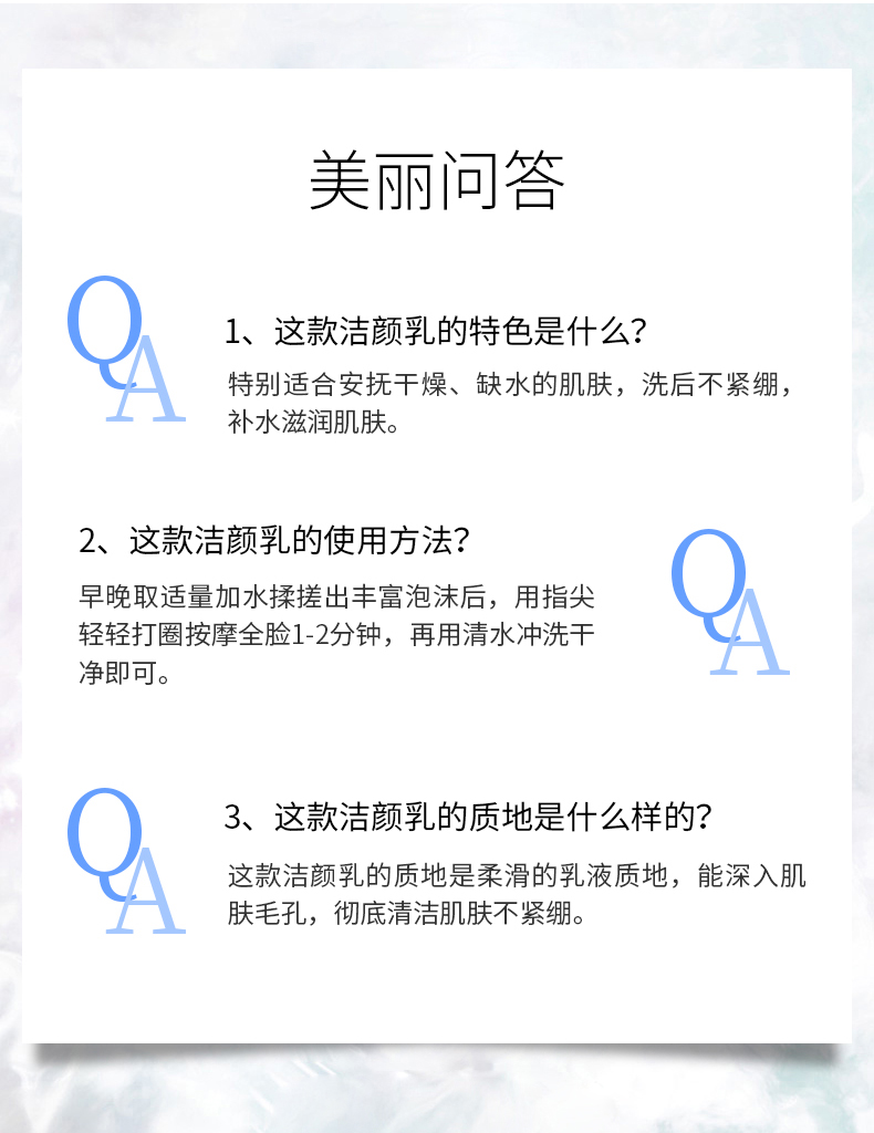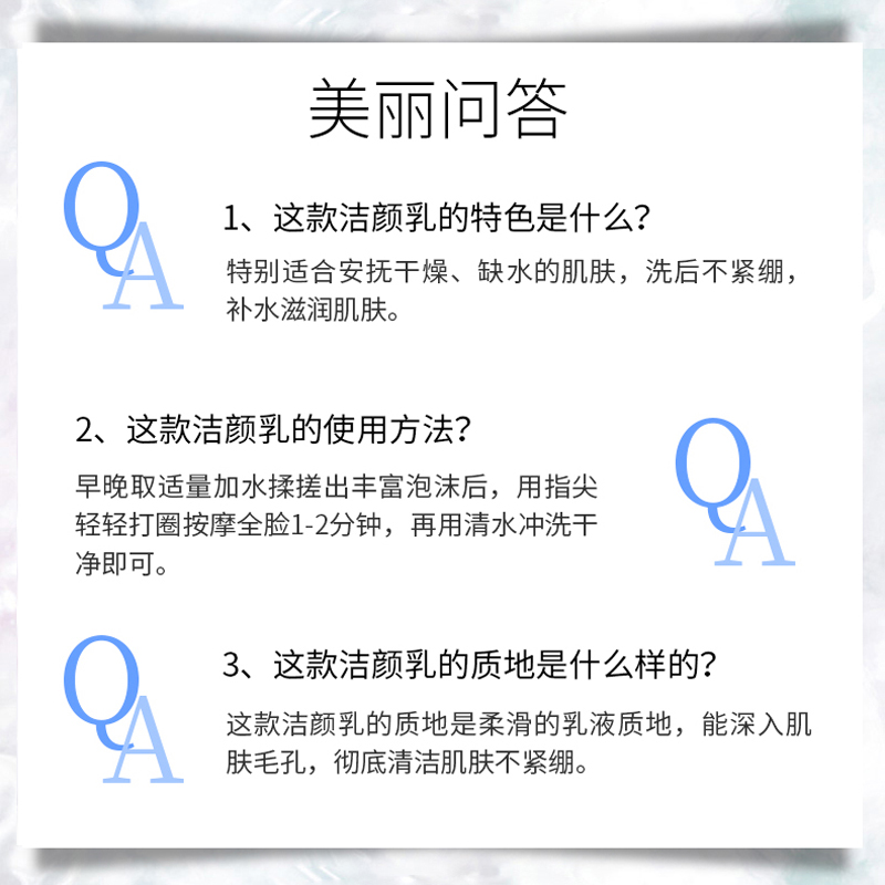 使用方法:早晚取适量加水揉搓出丰富泡沫后,用指尖轻轻打圈按摩全脸1-2分钟,再用清水冲洗干净即可。