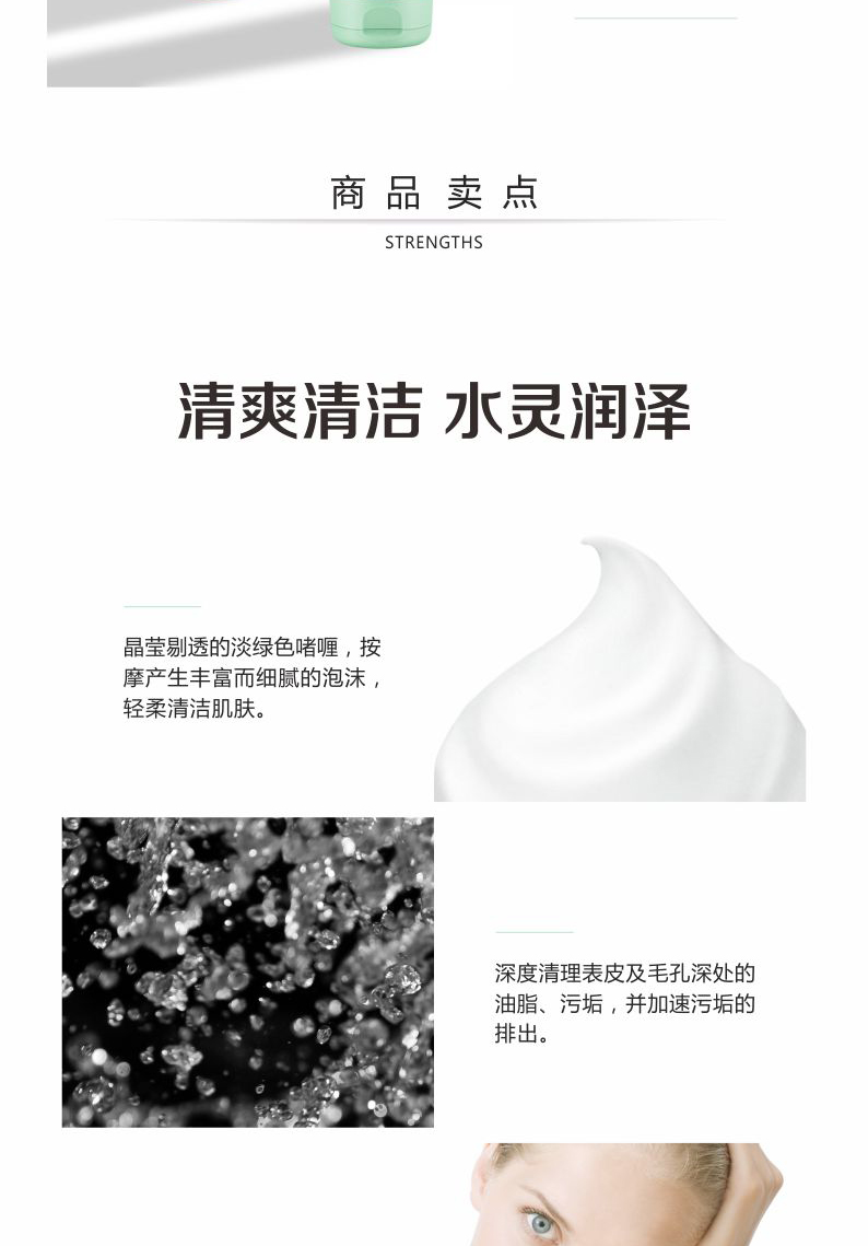 1.晶莹剔透的淡绿色嗜喱,按摩产生丰富而细腻的泡沫,给予肌肤轻柔而舒适的清洁。深度清理表皮及毛孔深处的油脂、污垢,并加速素和*********的排泄。用后不干燥不紧绷,触感细腻、水灵润泽。