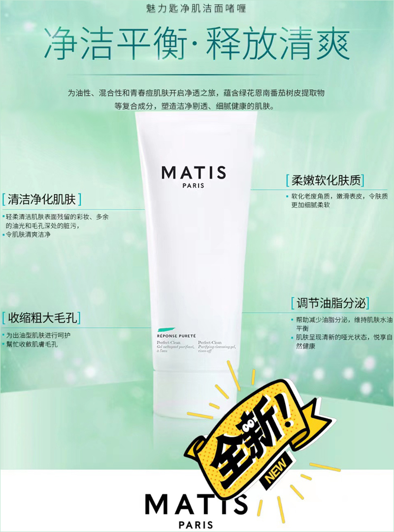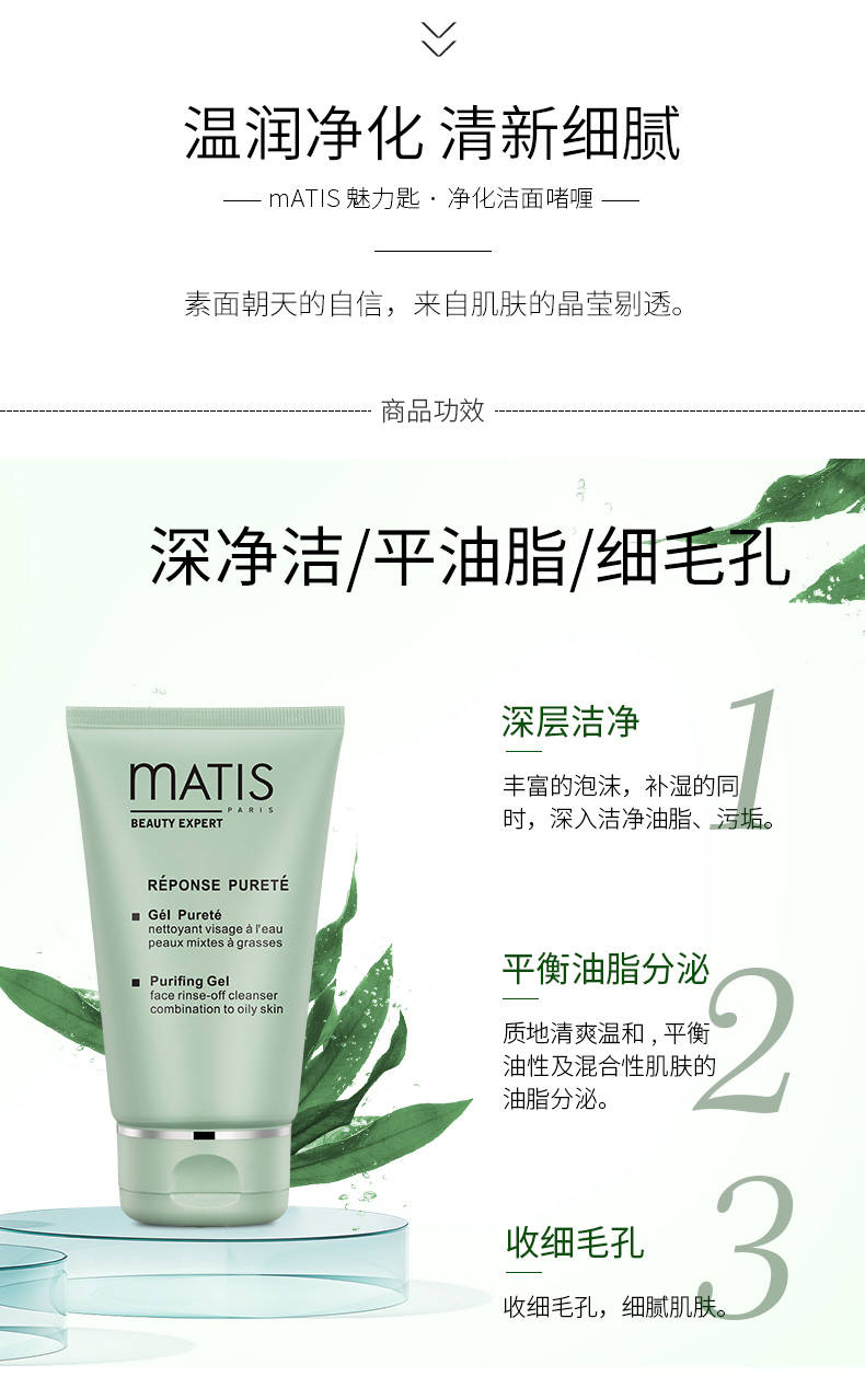 mATIS美容贴士:早晚取适量产品作用于充分湿润的面、颈部,轻柔按摩片刻产生丰富泡沫,然后以流动的水清洁干净。为获得好的清洁果,建议T区重点护理。
