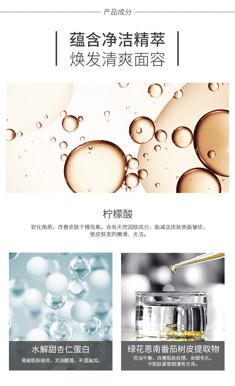 产品功效:用后不干燥、不紧绷、不油腻,触感细腻,肌肤水灵润泽。