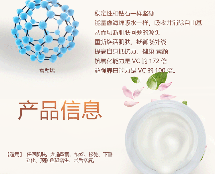 产品特色:此品添加抗氧化的富勒烯1.2%的高含量,交强去除自由基、抗氧化、抗老化、抗粗黑,能减少黑色素信号的传递,去除黑色素、亮白减斑、平衡油脂、亦能减少粉刺痘痘生长。