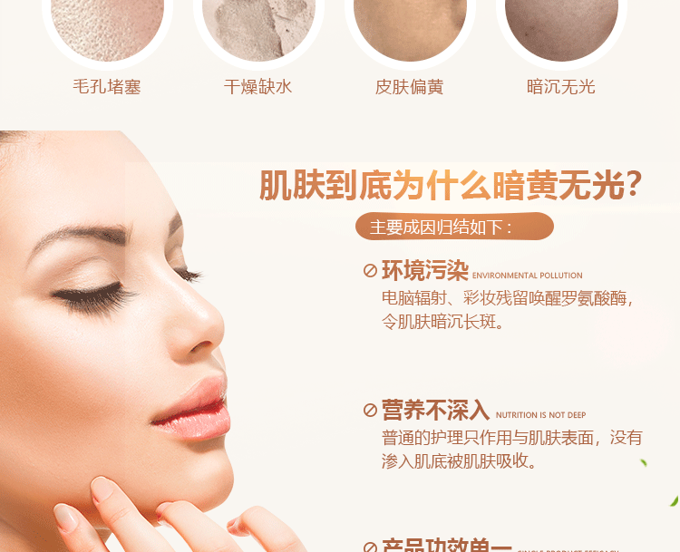 产品适用:任何肌肤。须保持年轻嫩白的肤颜,有面容老态/粗黑暗黄/顽固真皮层色沉色斑。