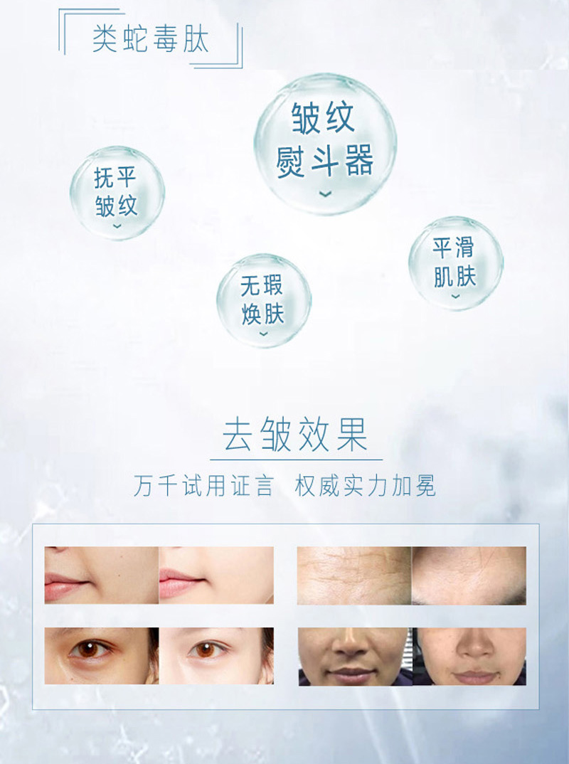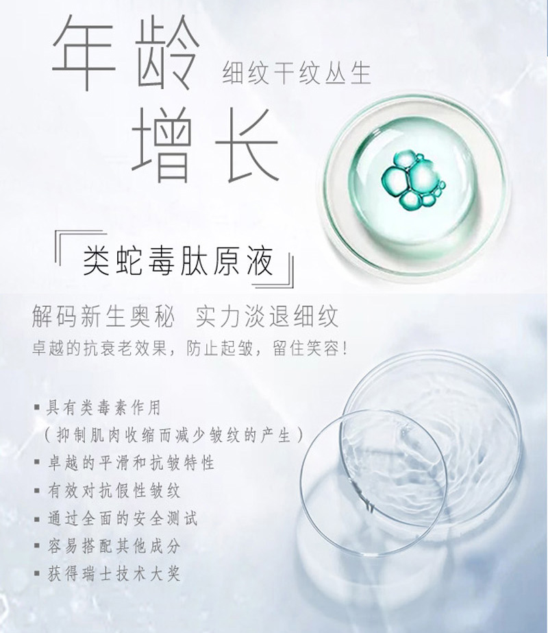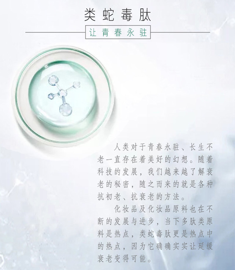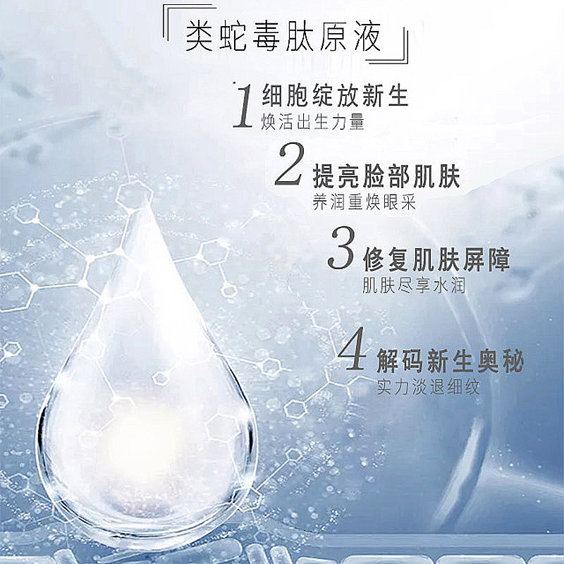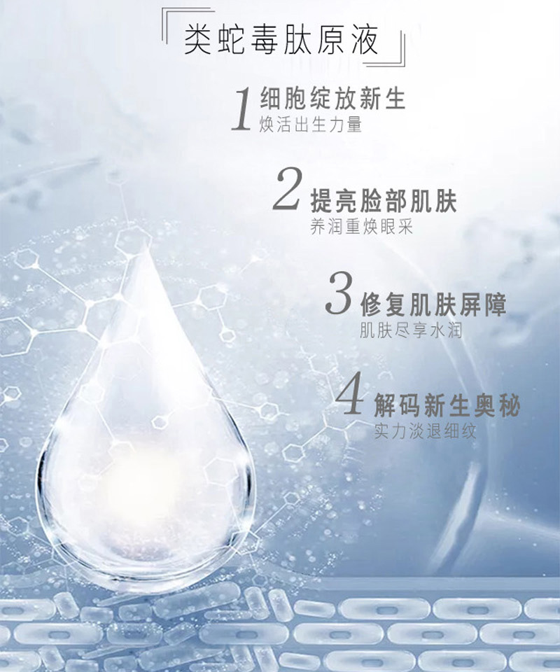 蕴含类蛇毒肽成分以及棕榈酰四肽-7等成分,滋养肌肤,紧致肌肤,修护肌肤,平滑肌肤,令肌肤焕发光彩