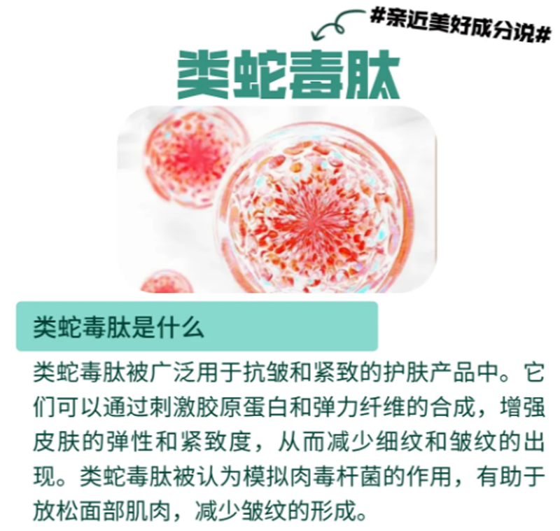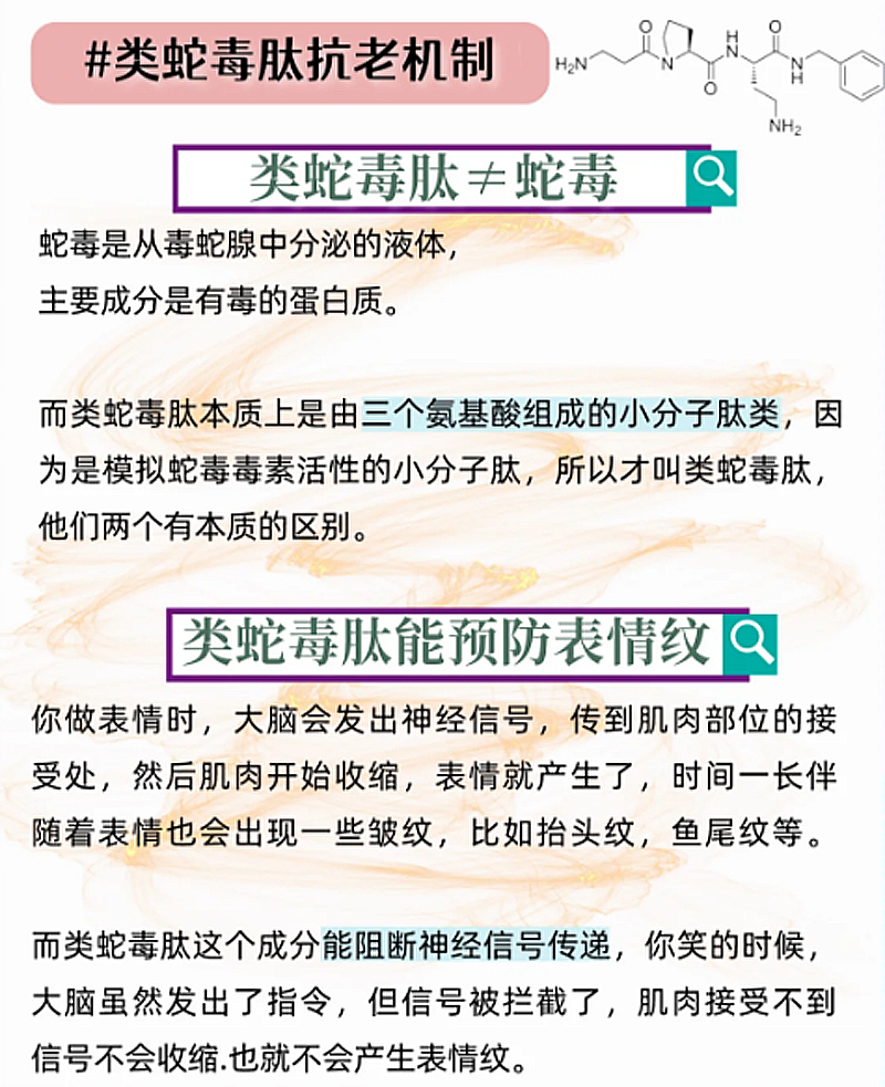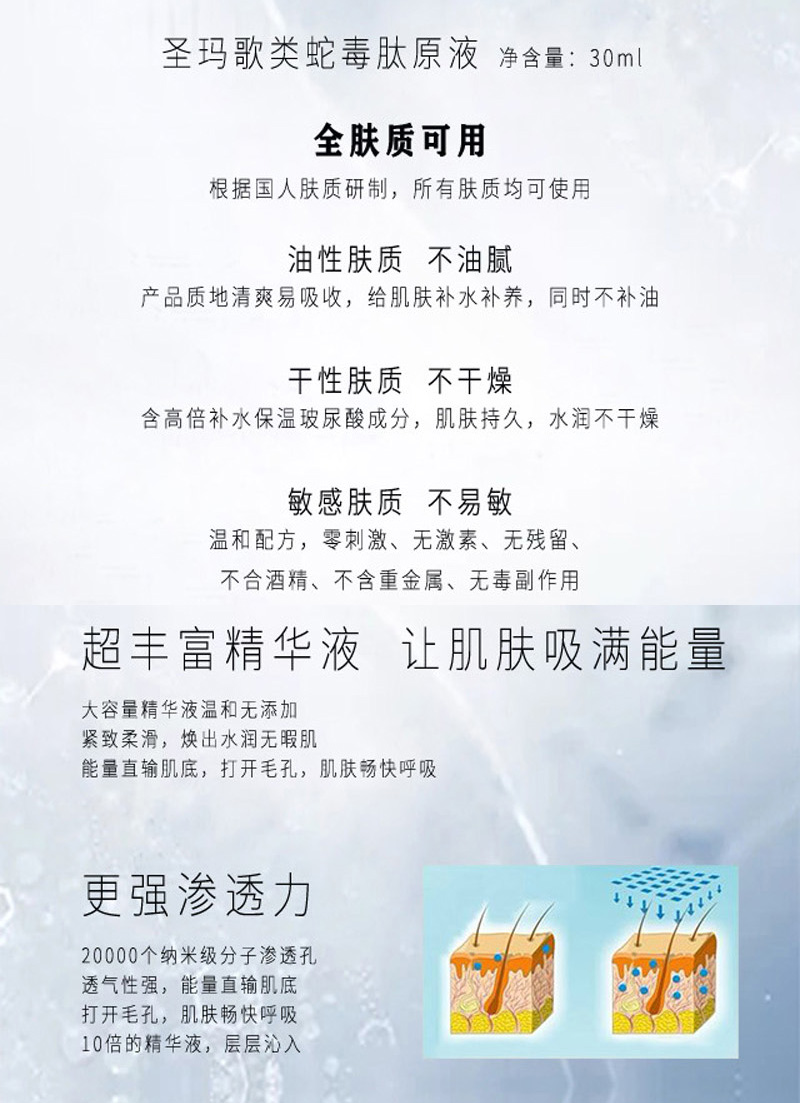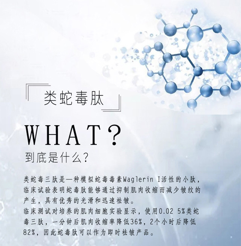 蕴含类蛇毒肽成分以及棕榈酰四肽-7等成分,滋养肌肤,紧致肌肤,修护肌肤,平滑肌肤,令肌肤焕发光彩