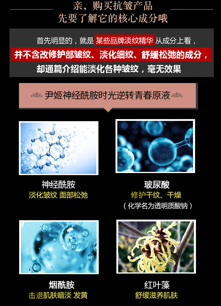 主要成分:水、甜菜碱、烟酰胺、红叶藻提取物、咖啡因 、神经酰胺 3、神经酰胺 6 II、尿囊素、透明质酸钠。