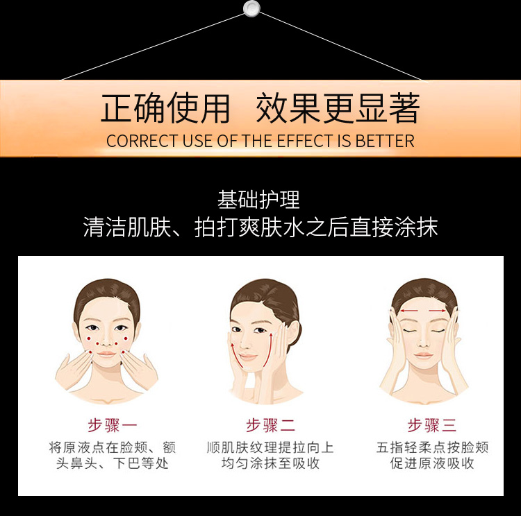 使用方法:洁肤爽肤后,取本品2-3滴,均匀涂于面部、颈部,轻柔按摩至吸收。搭配精华或营养霜使用果会更好。