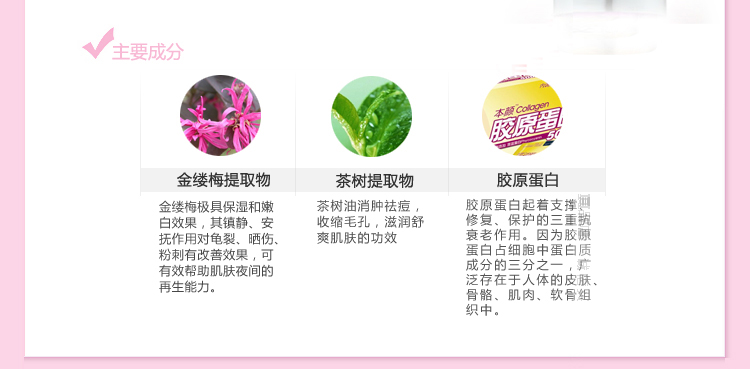 2.持续补充肌肤水分,帮助平衡肌肤水油状态,防止肌肤因缺水而油脂分泌过盛,改善外油内干的肤质,彻底摆脱油光脸;