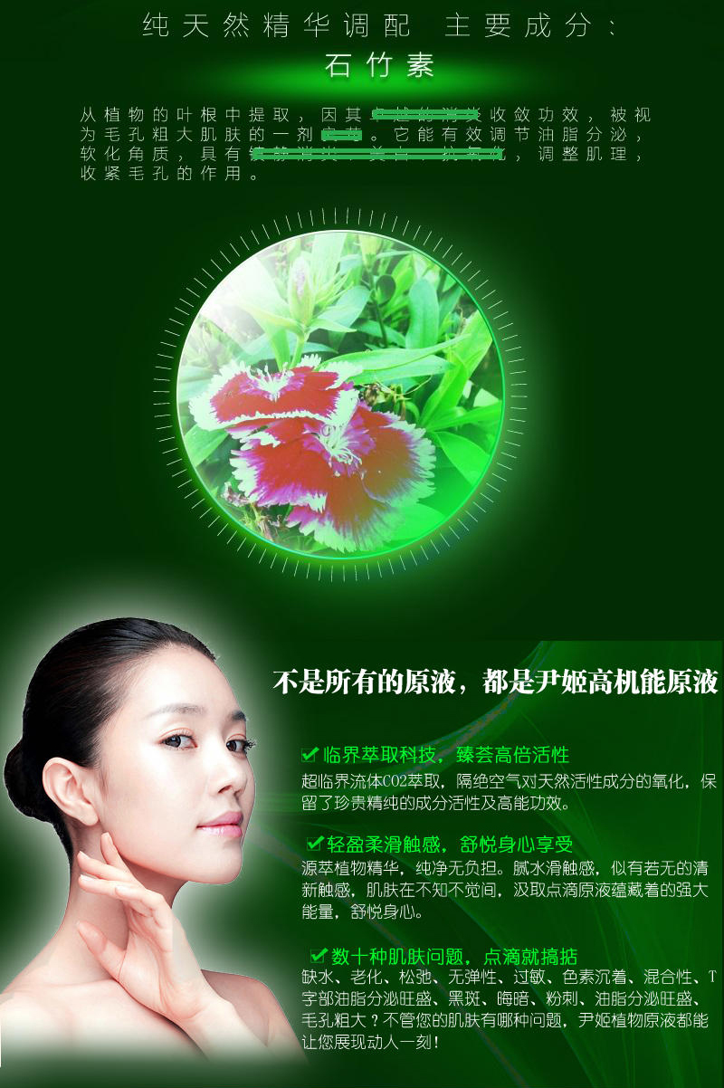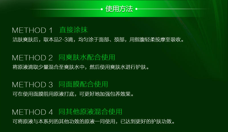 使用方法:洁肤爽肤后,取本品2-3滴,均匀涂于面部、颈部,轻柔按摩至吸收。搭配精华或营养霜使用果会更好。