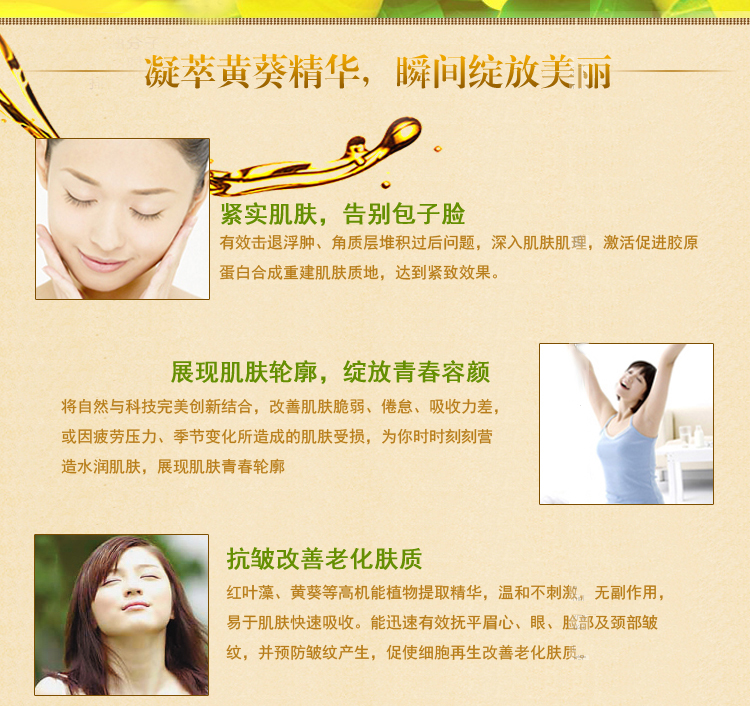 产品功效:红叶藻、黄葵等高机能植物提取精华,温和不刺激,无副作用,易于肌肤即时吸收。能即时有改善眉心、眼、脸部及颈部皱纹,并预防皱纹产生,促使改善老化肤质。同时具有年轻及成熟肌肤的抗老化、祛黄气,明显紧致老化松弛皮肤减少深层表现皱纹,改善细纹使肌肤恢复活力弹性光泽。