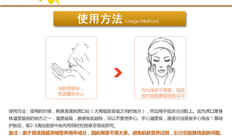 使用方法:洁肤爽肤后,取本品2-3滴,均匀涂于面部、颈部,轻柔按摩至吸收。搭配精华或营养霜使用果会更好。