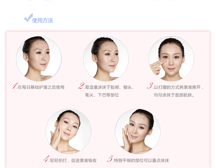 使用方法:洁肤爽肤后,取本品2-3滴,均匀涂于面部、颈部,轻柔按摩至吸收。搭配精华或营养霜使用果会更好。