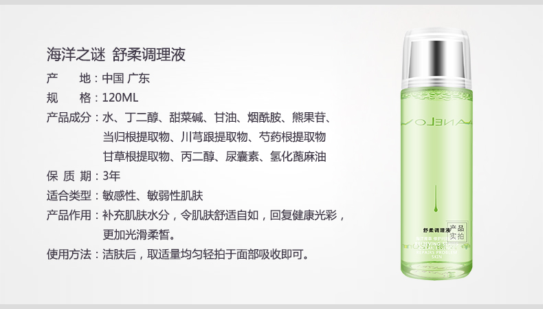 产品功效:含天然藻类精华,瞬间补充水分,及时舒缓调理,亦能平衡及柔化肌肤,改善肌肤红热等不适现象,可靠有效,强健肌肤抵抗力,令肌肤清新、舒适。