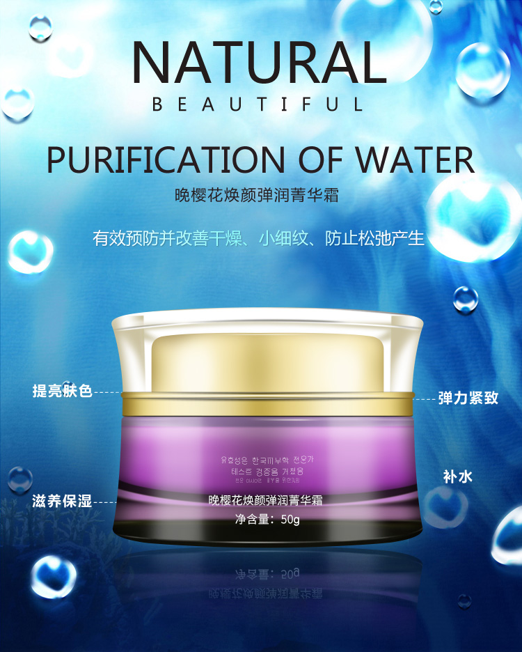 产品功效:蕴含知名养肤焕颜成分晚樱花精华,能在赋予肌肤滋润的同时,锁住肌肤内部水分,有预防并改善干燥、小细纹,更从肌肤内部带来弹力,防止松弛的产生,促进表皮营养交换,令肌肤自然焕发弹力润泽光采。