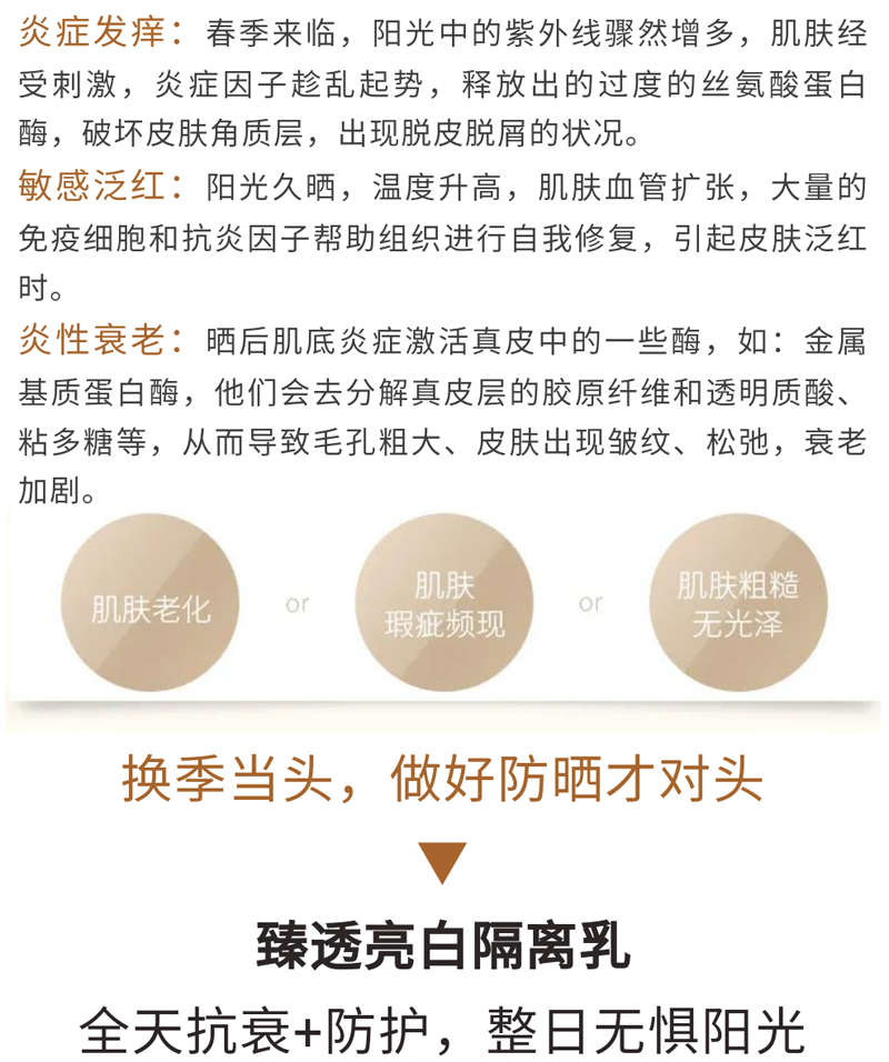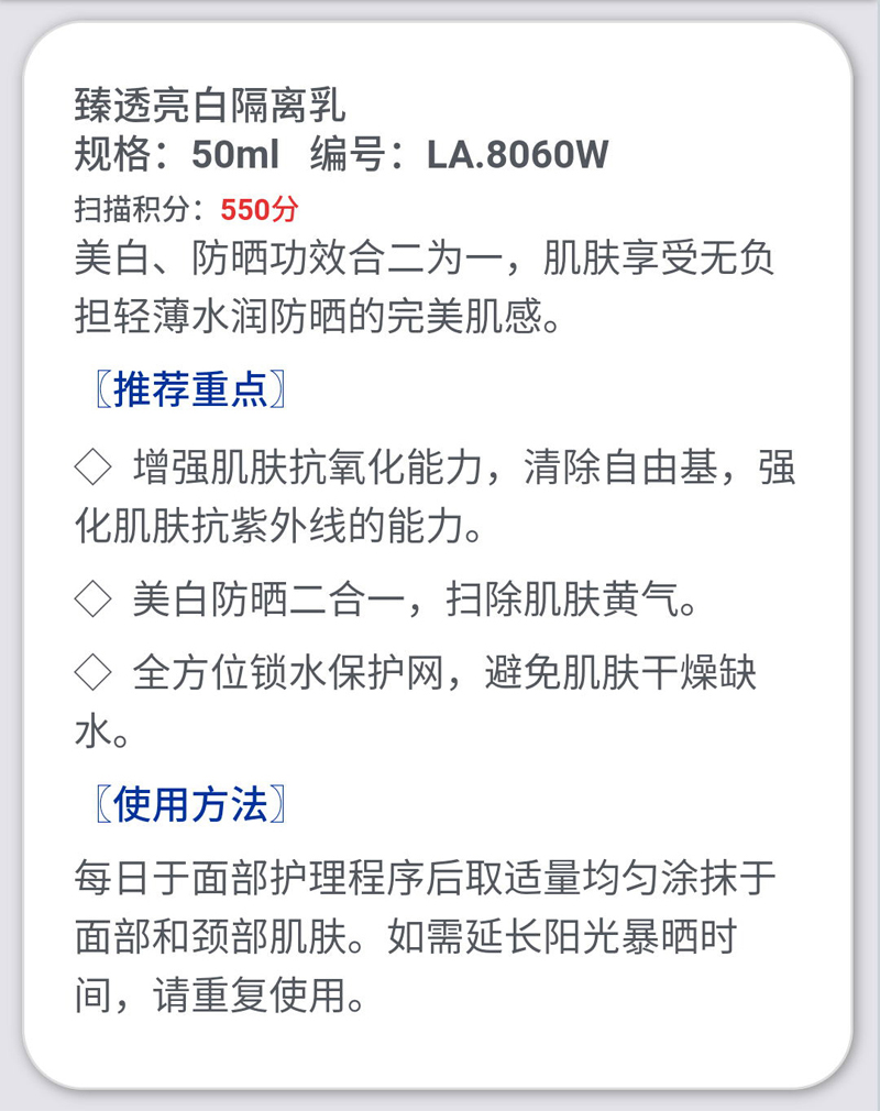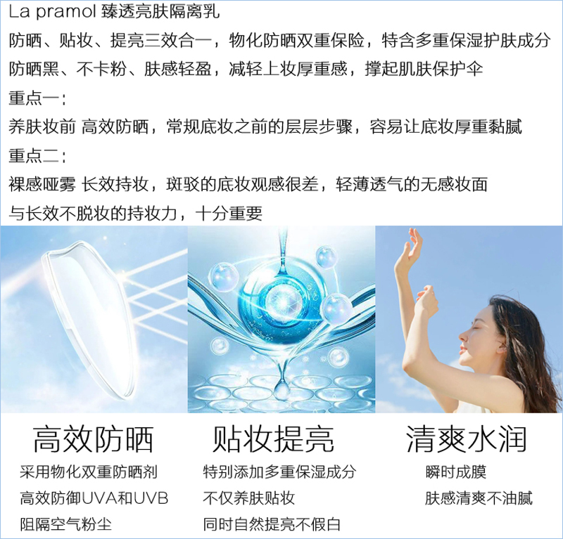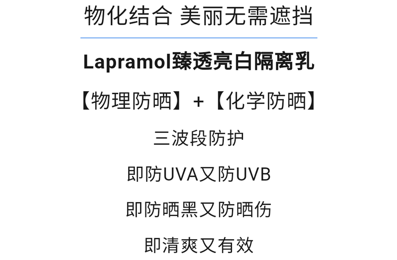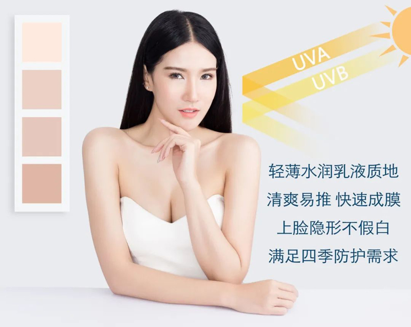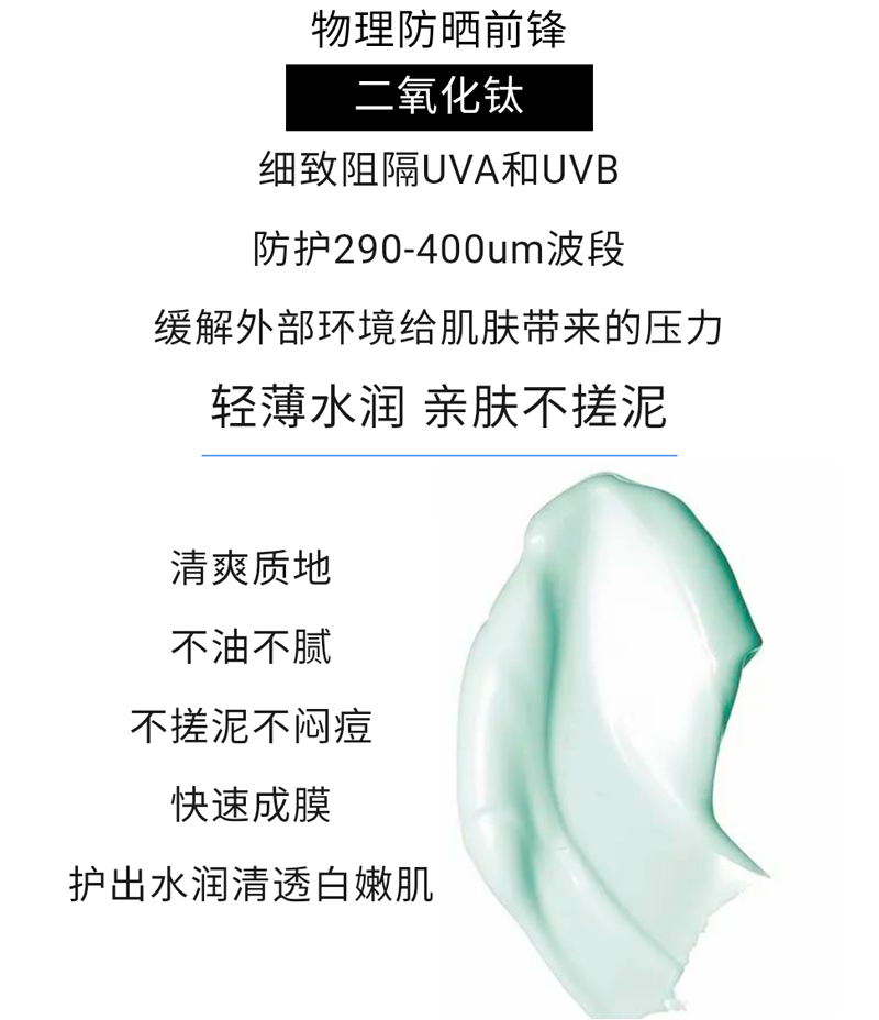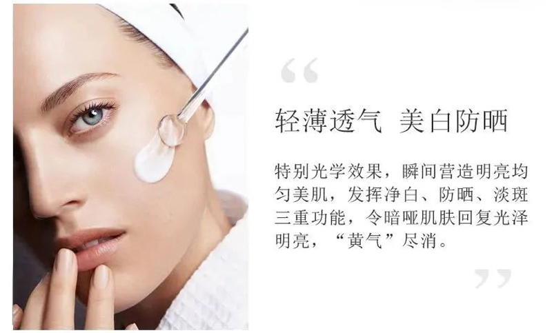 产品功效:亮白、防晒功效合二为一,肌肤享受无负担轻薄水润防晒的完美肌感。