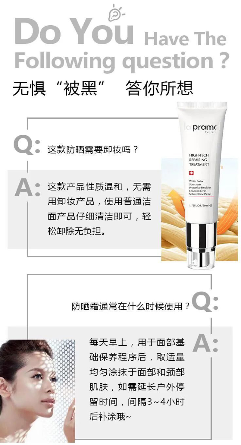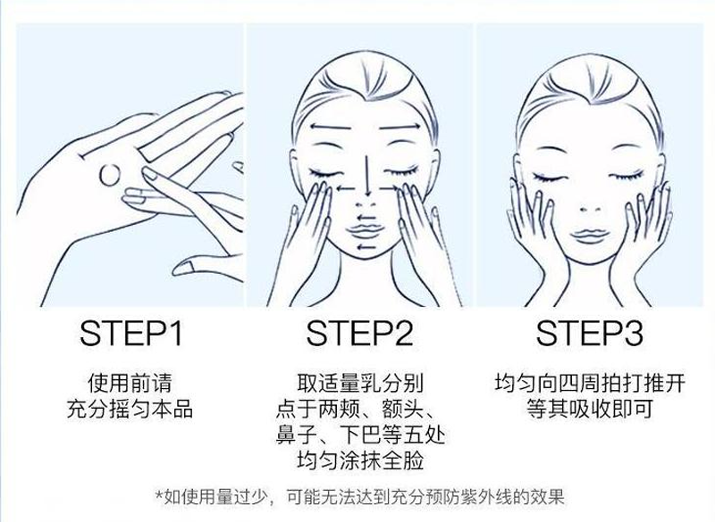 使用方法:每日于面部护理程序后取适量均匀涂抹于面部和颈部肌肤。如需延长阳光暴晒时间,请重复使
