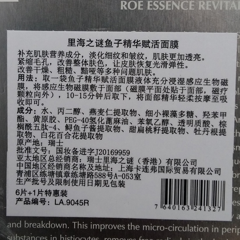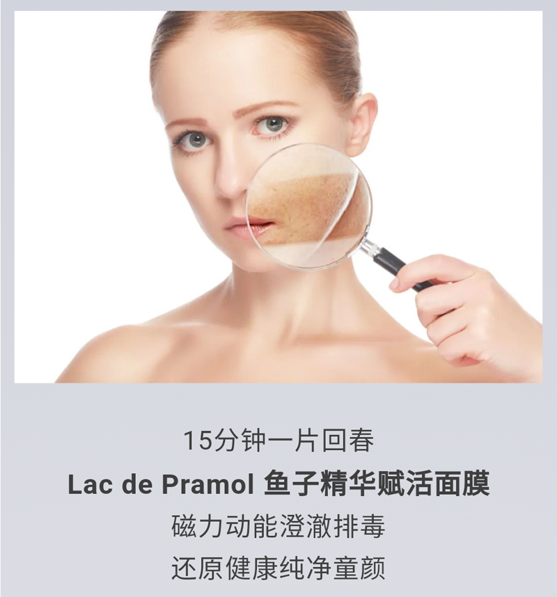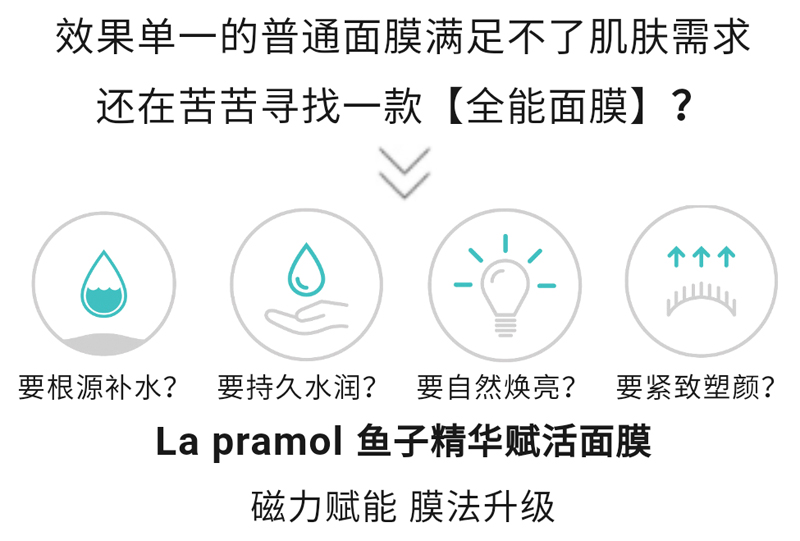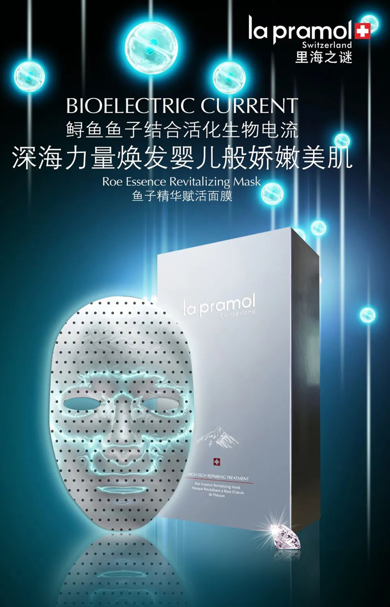 产品功效:瑞土La pramol研究院的研发人员与加拿大雅弗生物实验室、UBC大学、多伦多大学和滑铁卢大学尖生物学博士、电子物理学博士以及物理磁场学博士合作研发的鱼子精华赋活面膜,将鱼子精华、植物精萃等有护肤成分与纳米级智慧感应生物磁科技相结合,通过纳米红外理疗,改善肌肤微循环,同时修复多种肌肤问题。借磁珠稍作按摩半分钟即可达到传统面部拔筋30分钟的功!