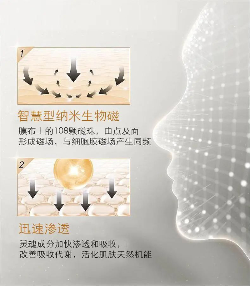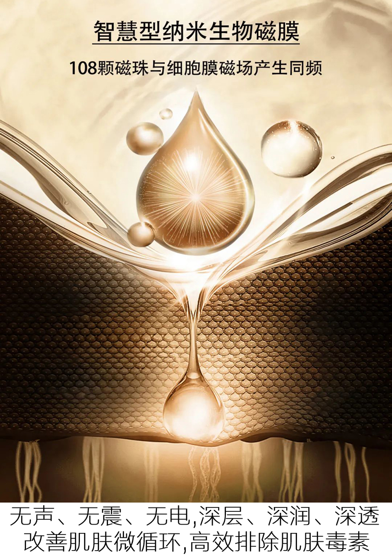 2.高科技太空磁膜紧密贴合肌肤,点阵式磁珠排列在肌肤表面形成微磁场,深层渗透改善吸收,开启无数肌肤吸收通道,加倍承载运输营养成分,令肌肤保养事半功倍。通过磁频作用力疏通经络、推动经气运行、促进血液循环,调节肌肤代谢紊乱等,使肌肤更加健康。
