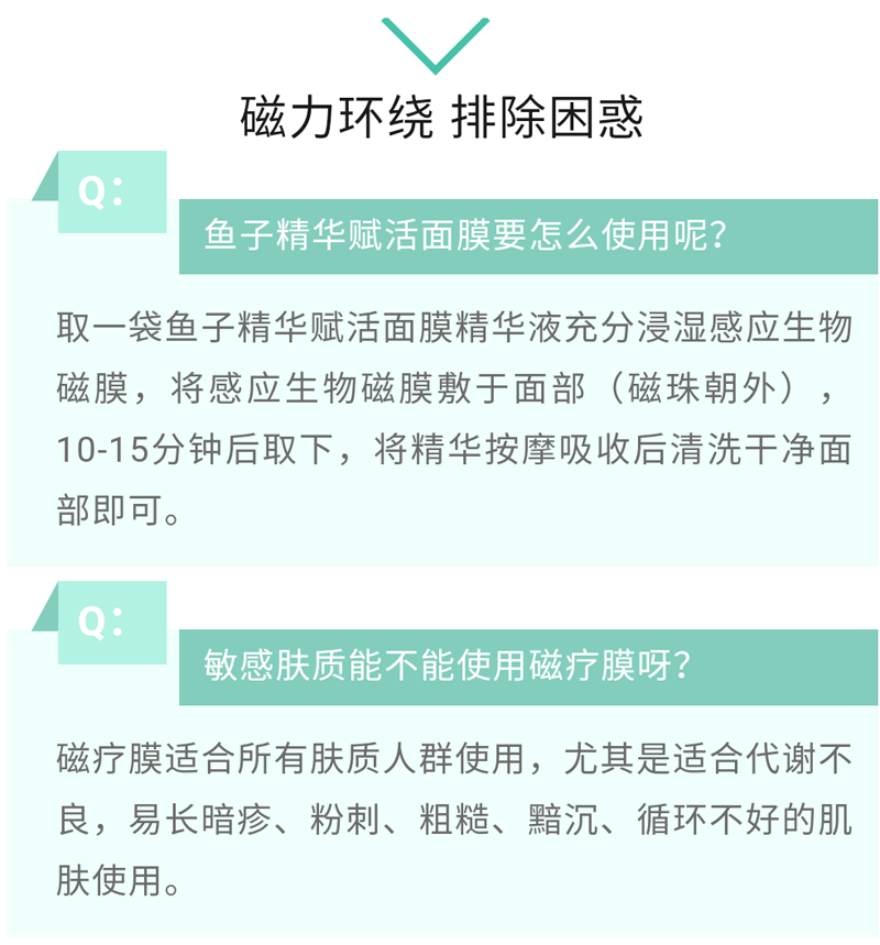 使用方法: 洁面后,用温水敷面,将鱼子精华赋活面膜取出敷于面部,隔膜稍作揉按面部磁珠后,让膜在面部停留15-20分钟后取下。