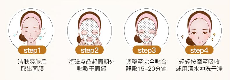 使用方法:取一袋面膜液充分浸湿太空磁膜,将太空磁膜敷于面部(磁膜平面处贴于面部,磁疗颗粒向外),10-15分钟后取下,将面部精华轻柔按摩至吸收即可。