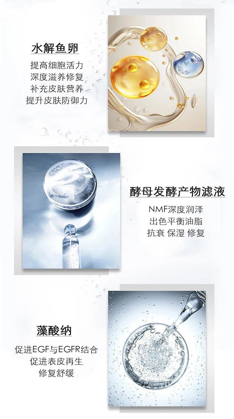 3.鲟鱼子酱提取物含有逆转寿命的生长因子,丰富的营养深层滋养修护肌肤,天然有的抗老化成分令肌肤年轻、光滑、紧实;棕榈酰五肽-4促进肌肤胶原蛋白、弹力纤维、透明质酸生成,提升肌肤的含水量和锁水度,淡化皱纹,饱满肌肤;多种植物提取物针对肌肤黯哑、发黄、肤色不均、色素沉着等问题进行修护,从内而外提亮肤色透出肌肤光泽。透明质酸钠可保护肌肤,保持肌肤滋润光滑,细腻柔嫩,富有弹性,避免肌肤干燥不适。
