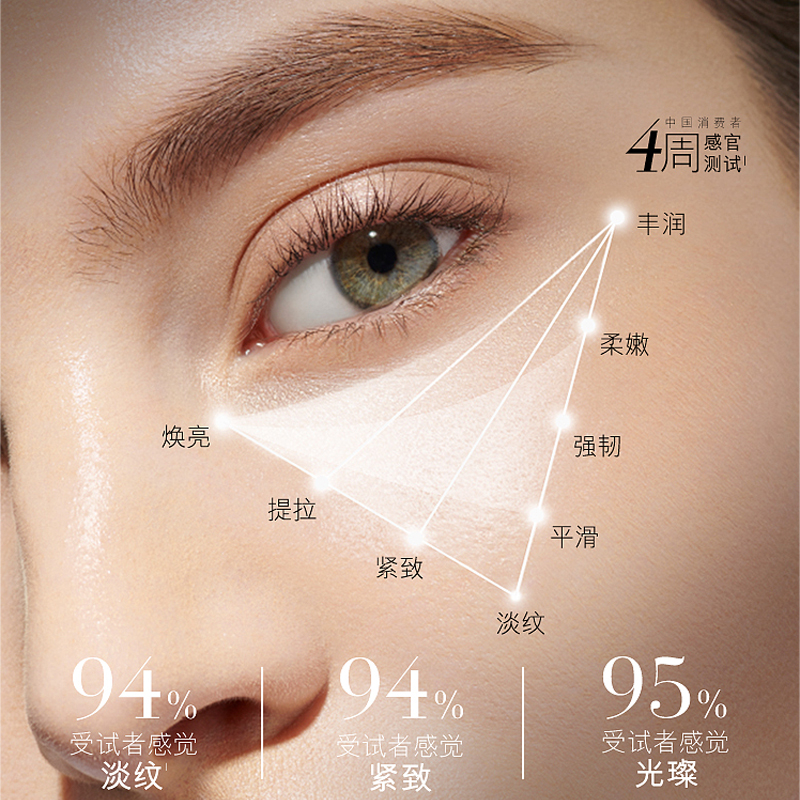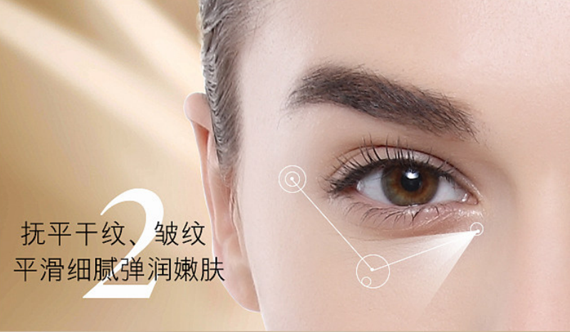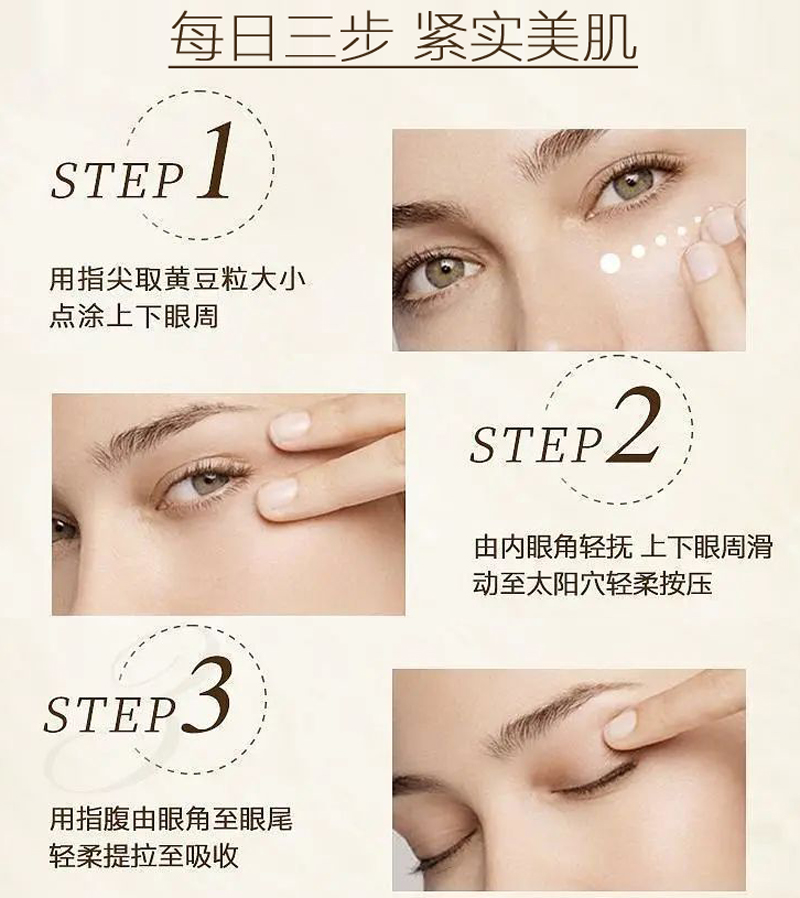 使用方法:早晚洁面爽肤后,取适量点于眼部周围的肌肤,按摩促使其被充分吸