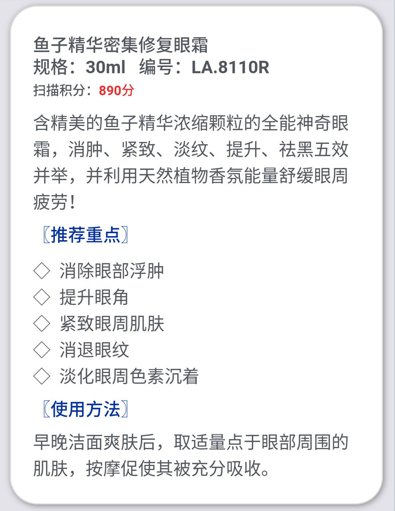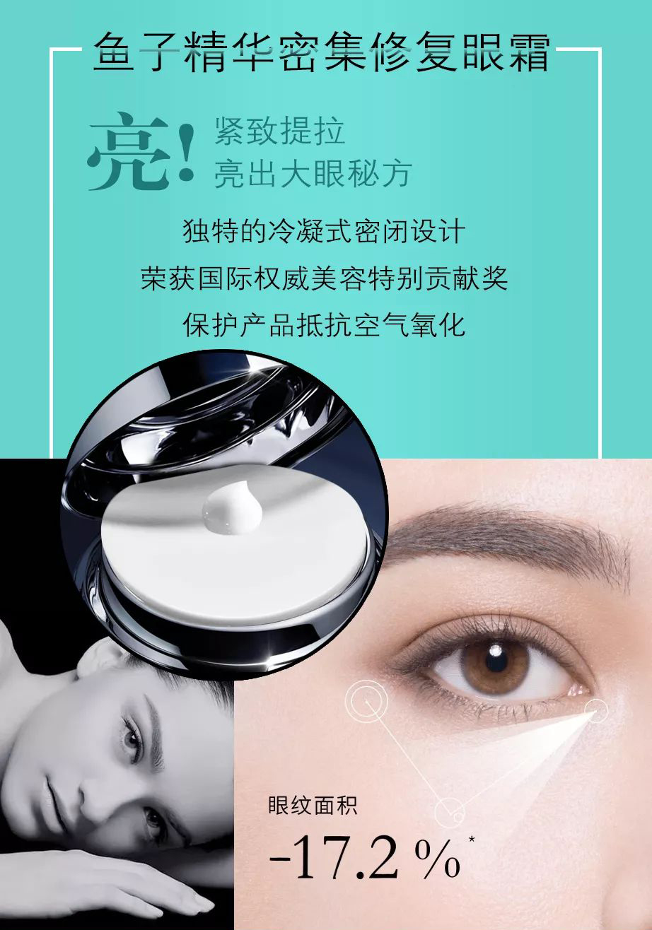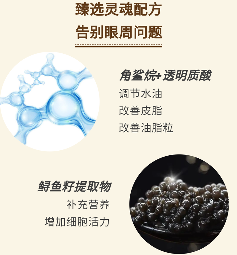 产品功效:含精美的鱼子精华浓缩颗粒的全能神奇眼霜,消肿、紧致、淡纹、提升、祛黑五并举,并利用天然植物香氛能量舒缓眼周疲劳!
