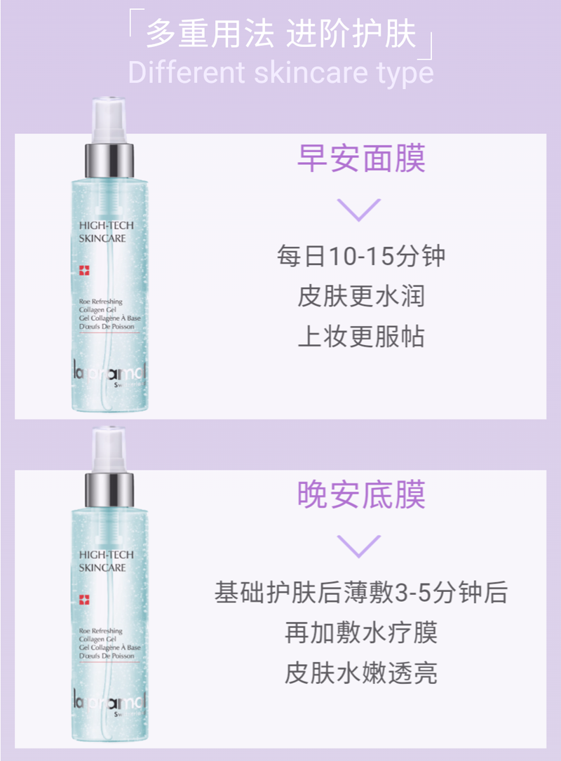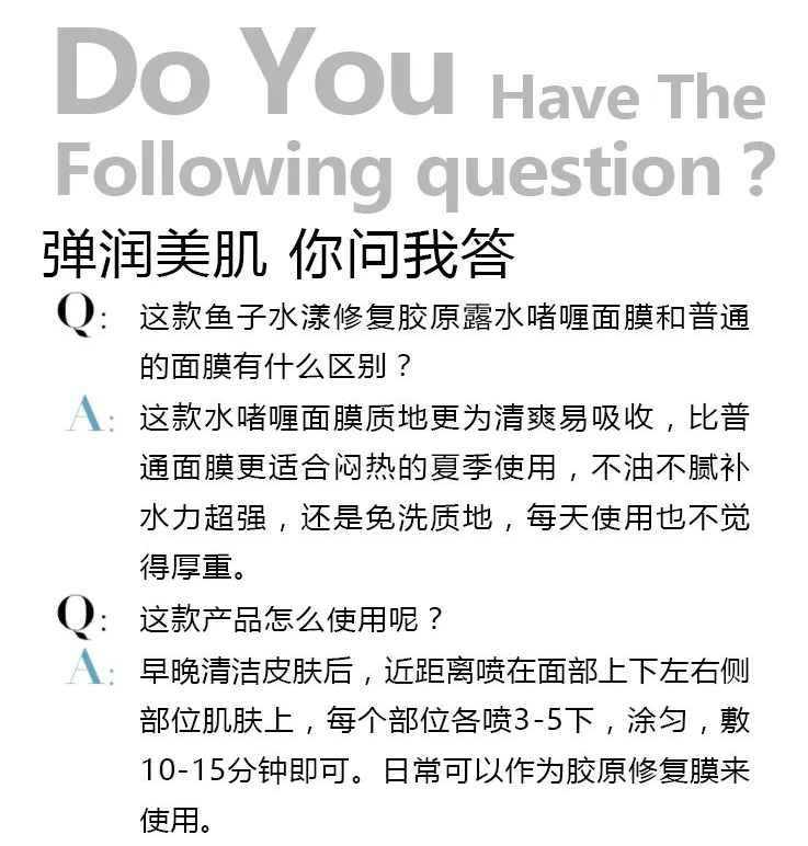 产品功效:既是修复性的爽肤水,又是为肌肤有补充胶原蛋白的精华水,还是天然胶原睡眠面膜,多重功并举,多方面修复肌肤。固体封存,雾状喷涂!