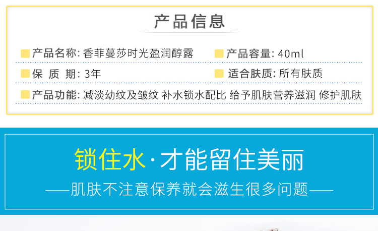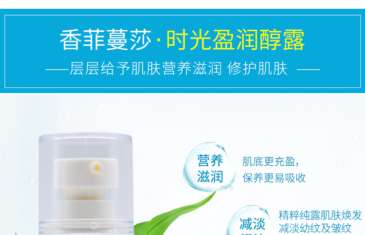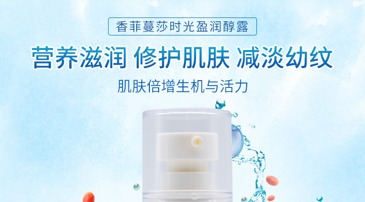 产品说明:精萃醇露,双倍的滋润果,促进肌肤焕新,减淡幼纹及皱纹;独特的补水锁水配比,层层给予肌肤营养滋养,修护肌肤,并进行焕新,令肌肤倍增生机与活力。