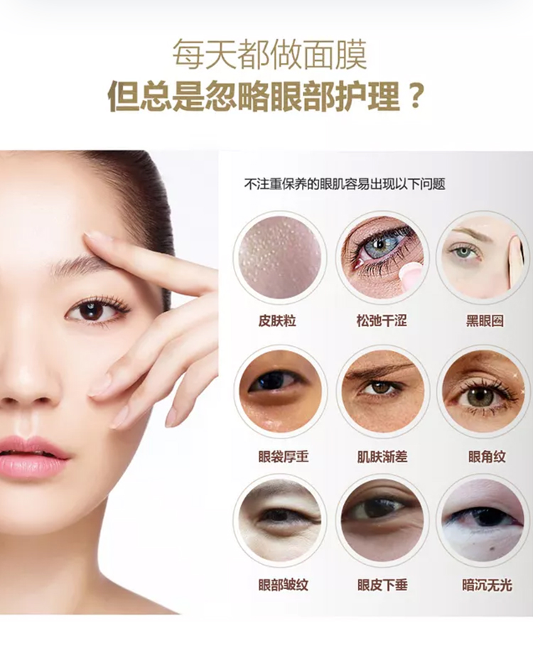 适用肤质:任何眼部肌肤都适用,特别针对黑眼圈、有细纹、眼袋的眼部肌肤。除了能用在眼部,还能敷在额头淡化细纹,还有唇周、颈部这些小细纹横生的地方也都可以用。