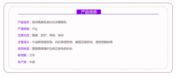 适用皮肤:需要隔离防护及修正肤色的肌肤。