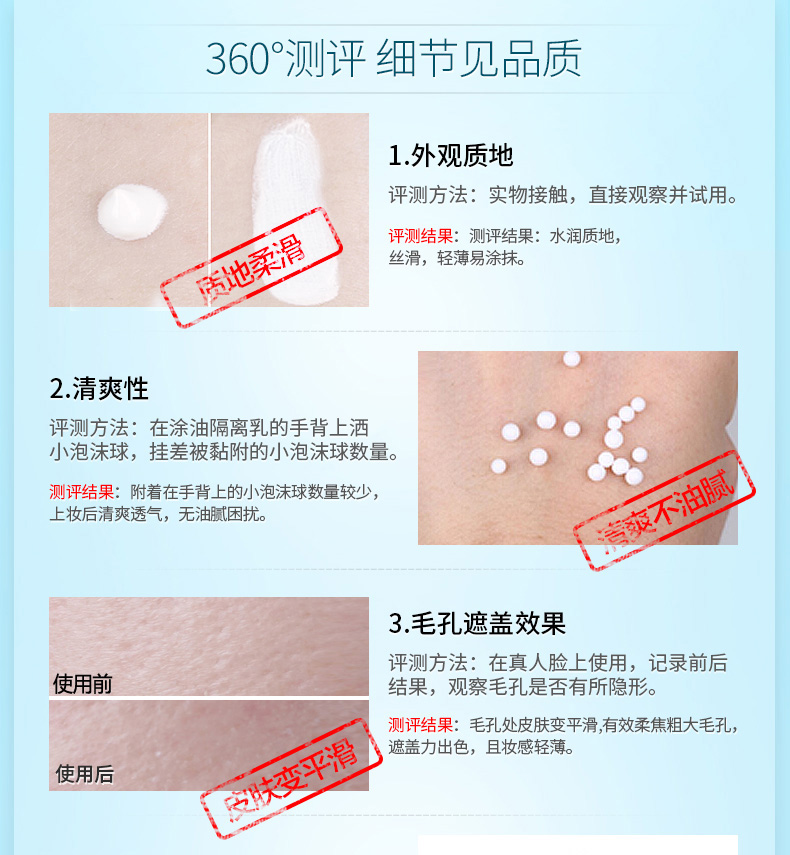 1、细腻光泽的乳液质地,薄润透气不露痕迹地修饰粗大毛孔及细小瑕疵,令肌肤没有浮妆负担感。