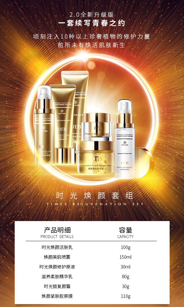 产品功:时光焕颜系列2.0全新升级版,科学精配匠心研制,精选名贵植物提取物,将其所蕴含的护肤美肌精萃通过生产工艺提炼出来,运用到肌肤护理中,其丰富的水分与养分,能深透沁入肌层中,释放出卓补水修护力,提高肌肤紧实度,长滋养,使肌肤变得水嫩紧实有弹性,为肌肤带来柔润、细滑的紧肤焕颜体验。