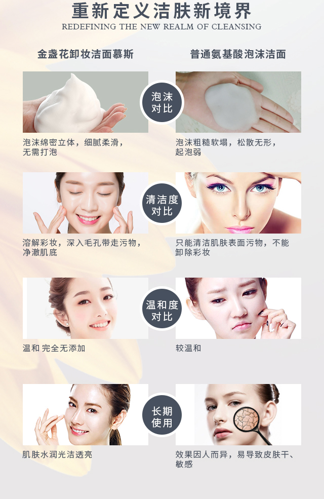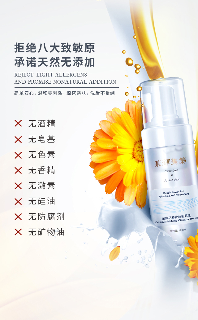 产品功:集卸妆、清洁为一体,泡沫绵密细腻,卓溶解面部彩妆及毛孔油污,特别融入金盏花精萃和氨基酸经典洁肤成分,温和洁净同时为肌肤注入充沛水分养分,深透保湿,舒润肌层,令肌肤清透柔滑不紧绷,绽放健康光洁之美。