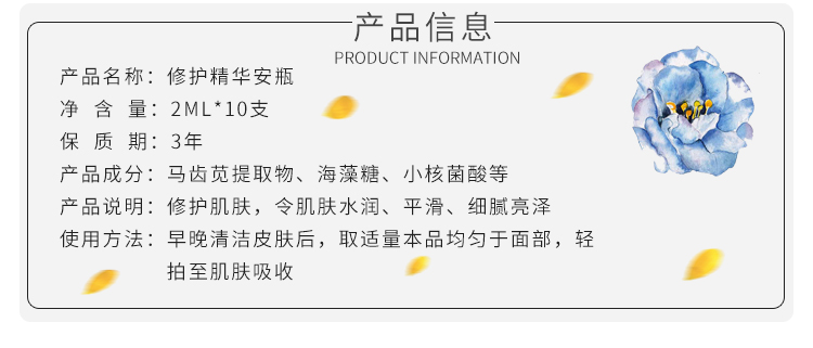 产品说明:受损肌肤,逾夜焕新。集合燕麦葡聚糖.酵母溶胞物提取物等修复因子.能即时修护受损,增加肌肤活力,增强肌肤保护屏障,修复肌肤短期受损及长期瑕疵.令肌肤重回六大完美表现.均衡、活力、水润、平滑、细腻、亮泽。
