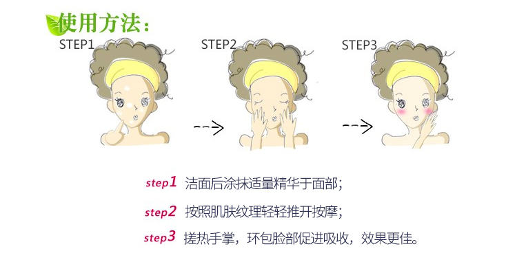 使用方法:每日早晚清洁皮肤后,并使用基本护理产品后,取适量本品沿肌肤纹理轻柔涂抹于整个脸部和颈部皮肤,轻拍至吸收,配合使用同系产品果更佳。