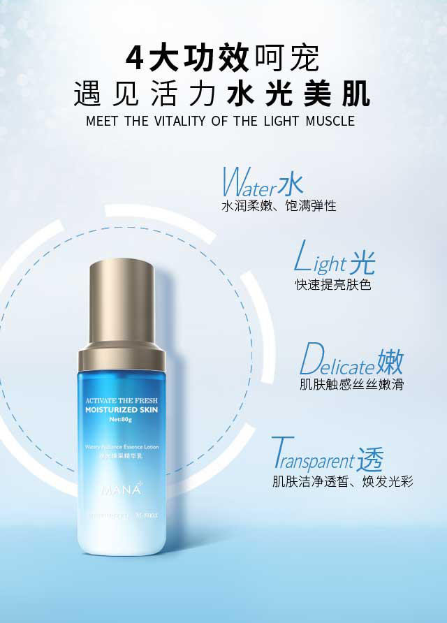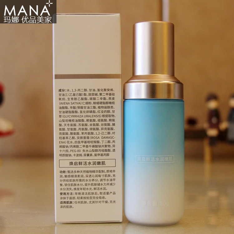 产品功:甄选多种天然植物精华配制,质地丰润,触感细滑柔润,深透沁润每寸肌肤,充分供给肌肤所需的水分养分,调节水油平衡,锁住肌肤水分,提升肌肤储水力并减少水分流失,焕发年轻水光、鲜活水润。