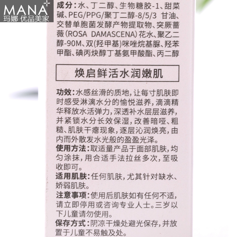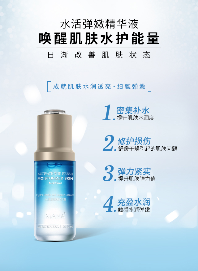 产品功:水感丝滑的质地,让每寸肌肤即时感受淋漓水分的愉悦滋养,滴滴精华释放水活弹力,深透补水层层滋养,并紧锁水分长保湿,改善暗哑、粗糙、肌肤干瘪现象,逐层沁润焕亮,由内而外散发水光般的盈盈光泽。