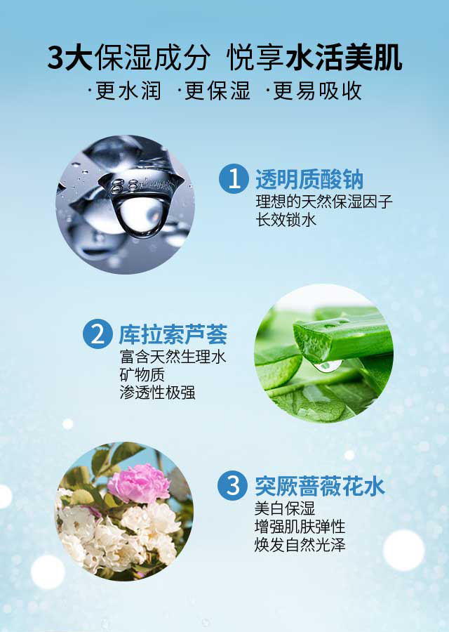 使用方法:洁肤后,取适量产品轻拍于面部及颈部肌肤,充分吸收即可。