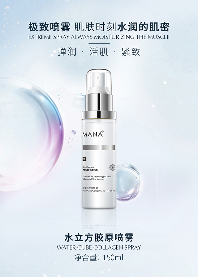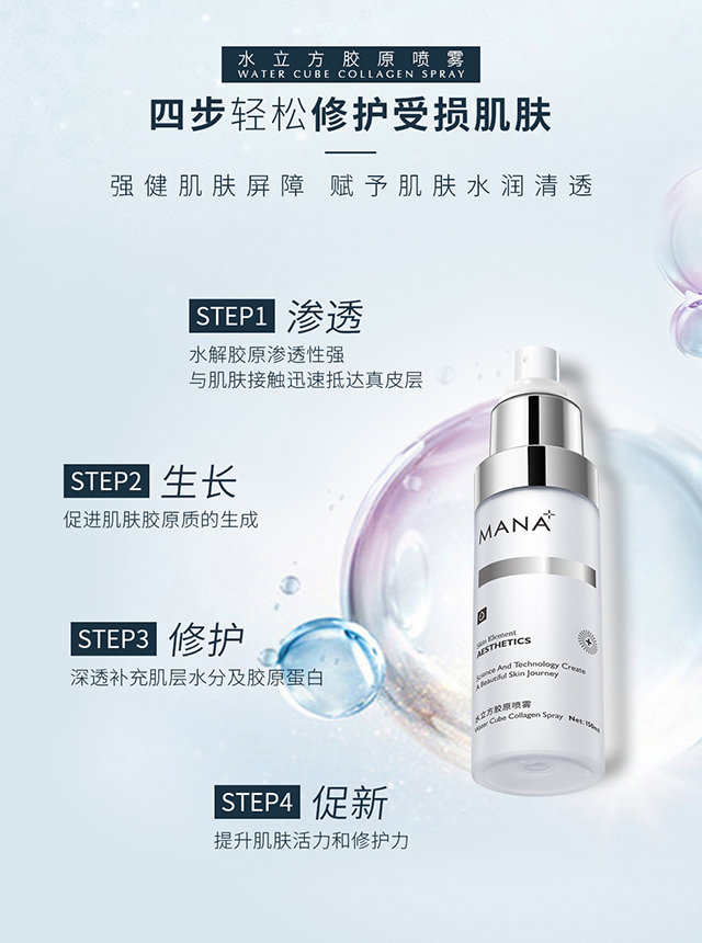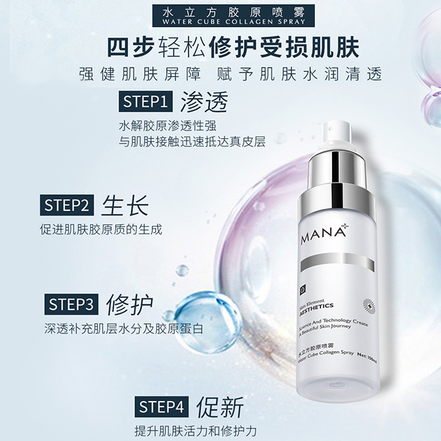 产品功:薄雾清爽质感,让肌肤即可感受淋漓水分,深透补充肌层水分及水解胶原,促进肌肤胶原质的吸收,提升肌肤活力和修护力,赋予肌肤水润清透。