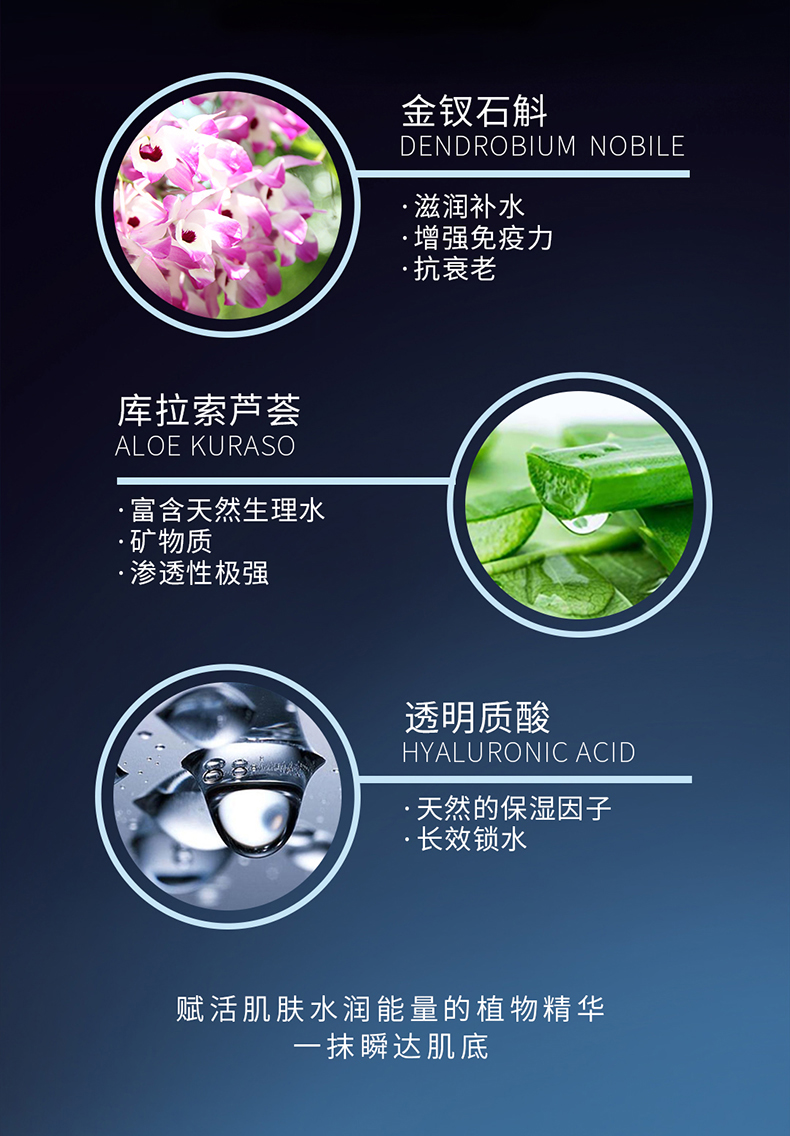 产品功:添加多种补水保湿成分和珍奢植物提取物,轻抹释放补水保湿精华,将大量水分深透沁入肌肤,充盈滋养,防护锁水,有改善改善干燥、粗糙肌质,令肌肤由内而外散发水光般的盈盈光泽。
